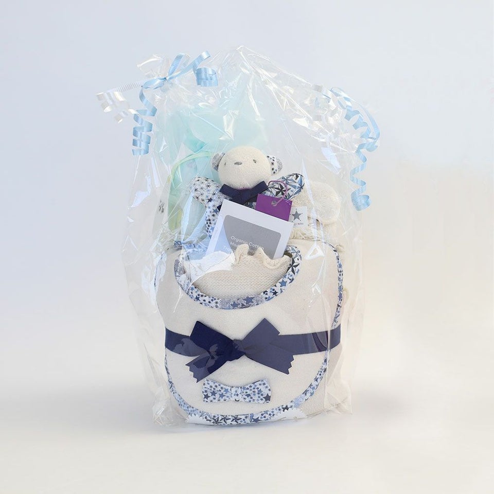 オーガニック腹巻、オーガニックパイルスタイ、リバティプリントのラトル、パイルハンカチとSサイズのおむつ10枚のセット。