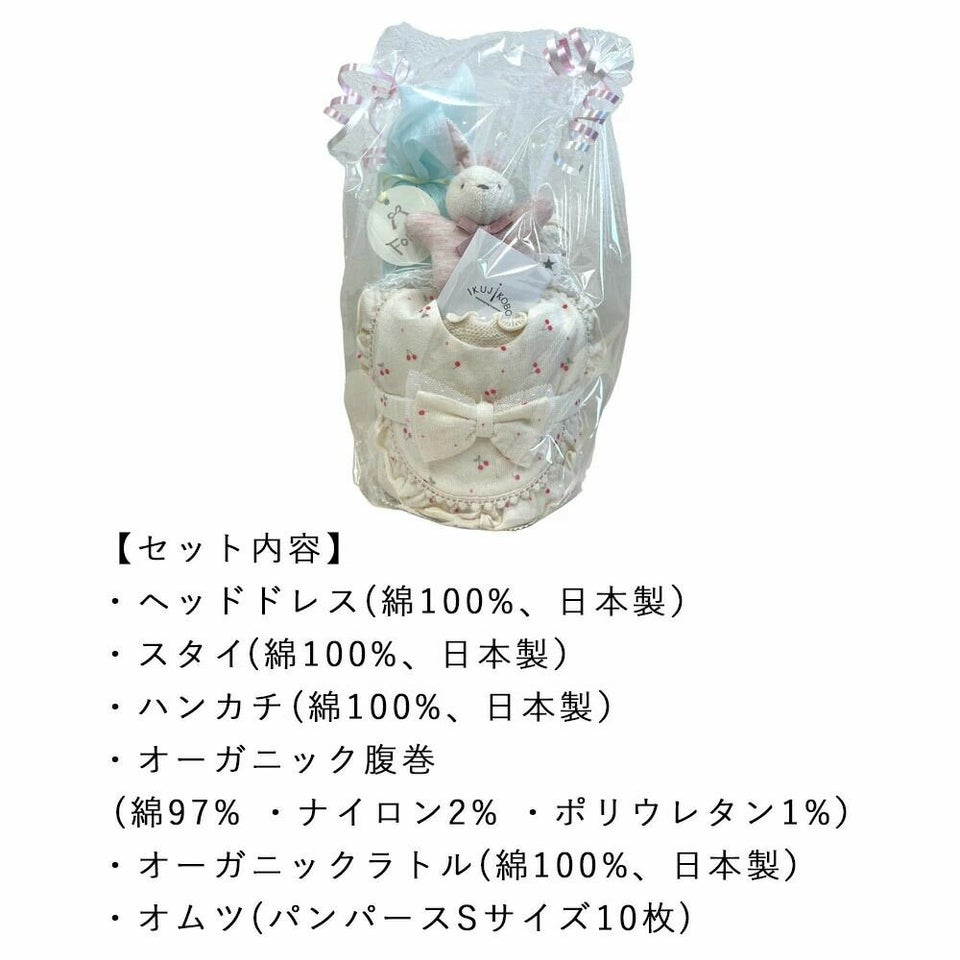 ラッピング無料 日本製 オーガニックコットン お洒落なおむつケーキ ヘッドドレス、腹巻、ハンカチ、にぎにぎ、スタイ、おむつ パンパースSサイズ10枚セット 出産祝いにおすすめ