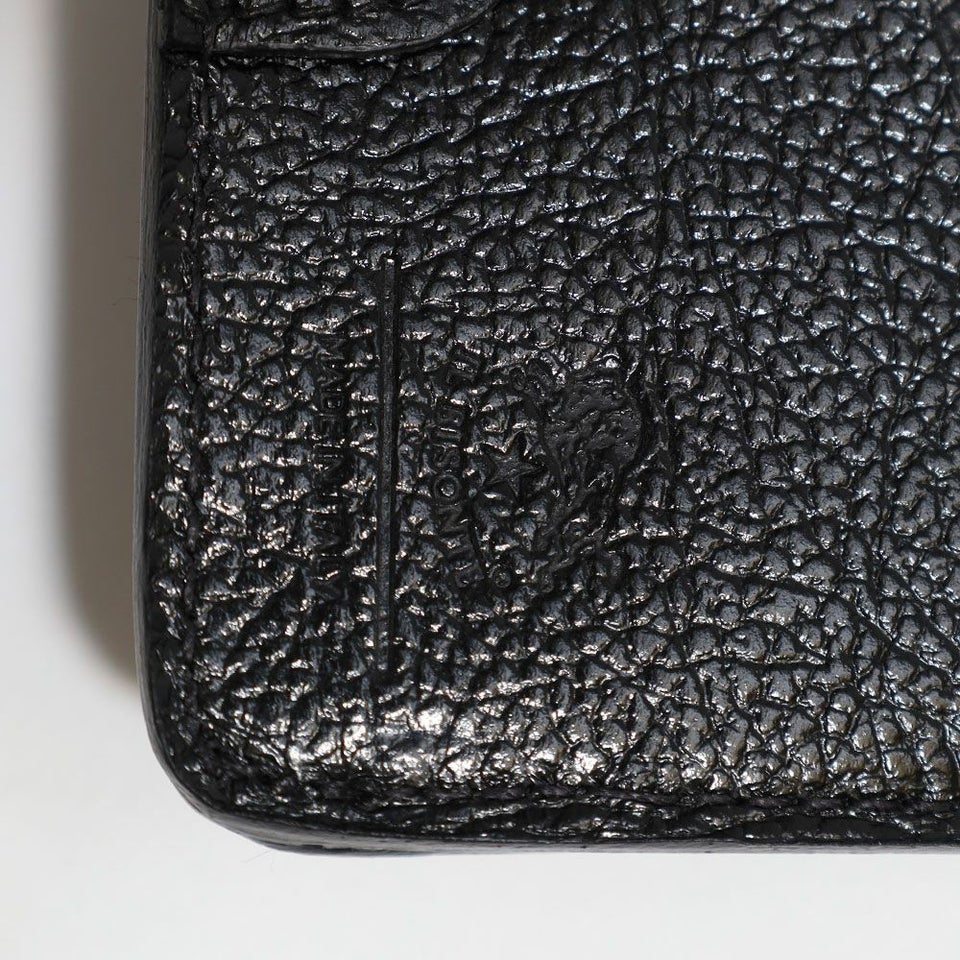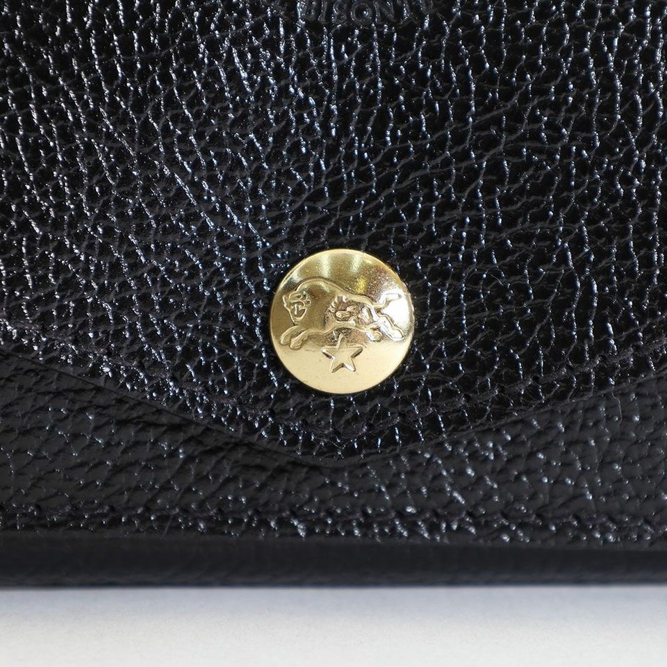 フラップ部分はV字カットでシャープに仕上げ、型押しエンブレムが高級感を演出。シンプルながら印象的なデザインです。