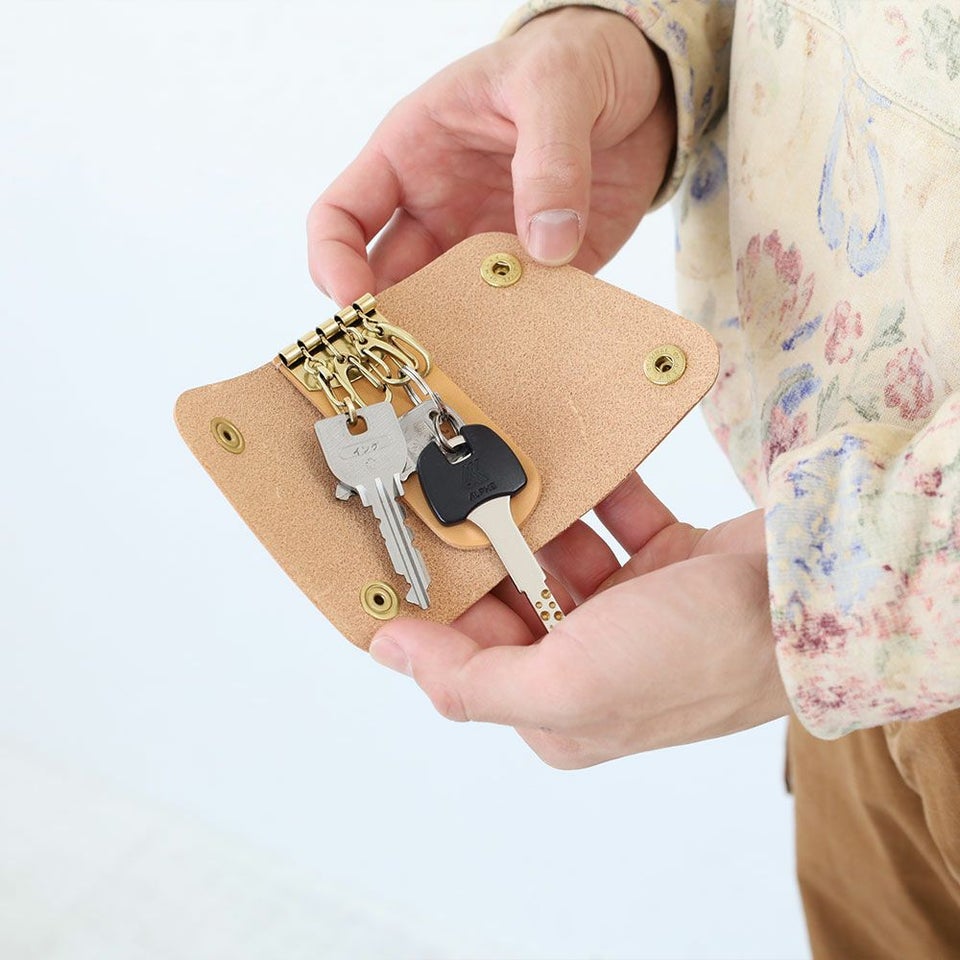 2つのコンチョボタンがポイントのレザーキーケースは、4連のフックにカギを取り付けるスタンダードなデザインです。