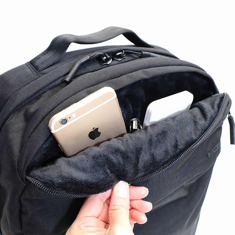 内装背面側には起毛の裏地で作られた16インチまでのノートPCを収納可能なポケットが用意されています。