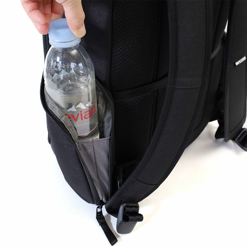 サイドには、ドリンクボトルも収納可能な伸縮ジップ付きポケット付き。