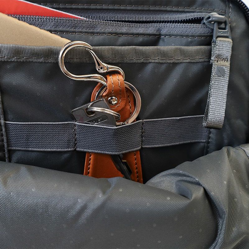 メインファブリックには、水や汚れに強い撥水加工を施したリサイクルポリエステルを使用し、多様なギミックを搭載。