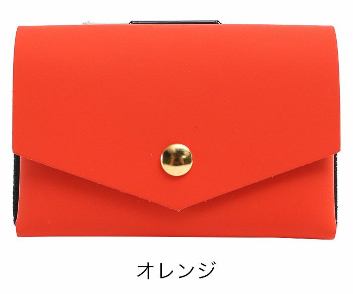 特徴は、カードを背面のゴムに重ねて収納、プルタブを引くことで取りやすくなっています。紙幣は二つ折りで入れていただき、小銭は手前のポケットに収納。紙幣は二つ折りで10枚、コインは20枚、カードは5枚ほどと、そのコンパクトさ以上の十分な収納力のある財布です。