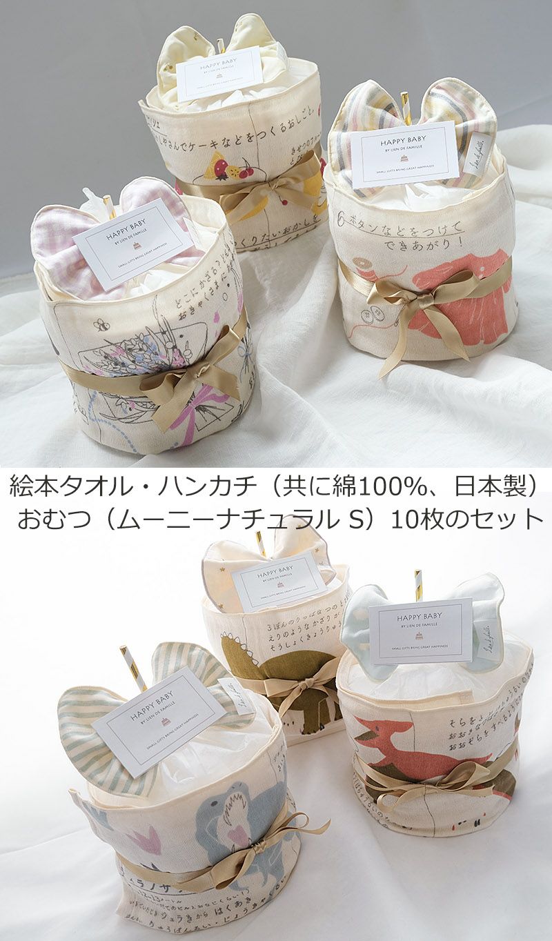日本製、コットン100%の絵本タオルとハンカチ、Sサイズのおむつ10枚のセット。