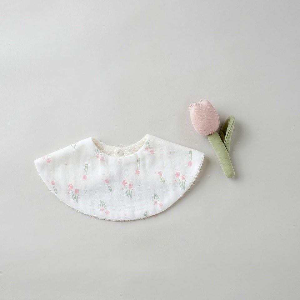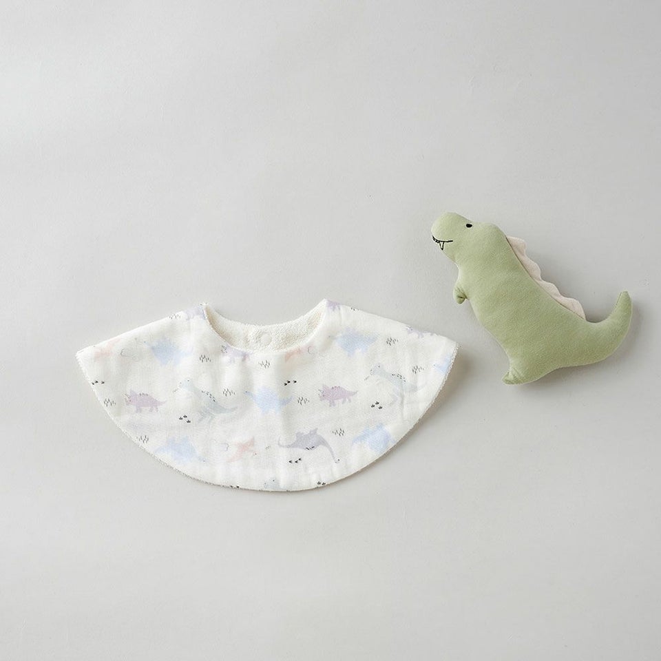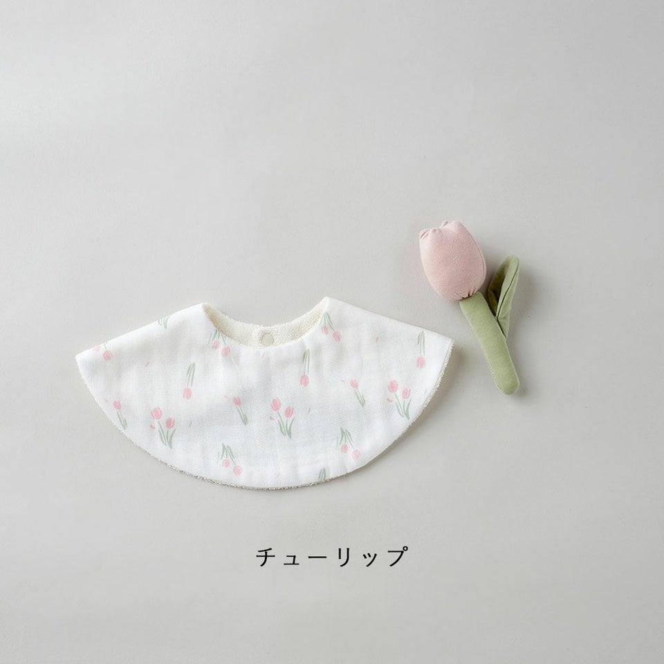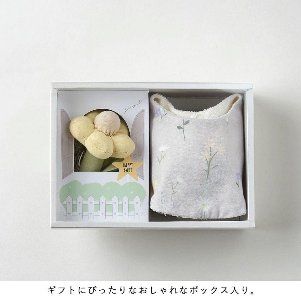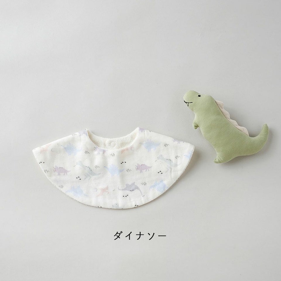 吸水性と肌触りにこだわったダブルガーゼスタイと柔らかな綿100%の日本製ラトルのセットです。