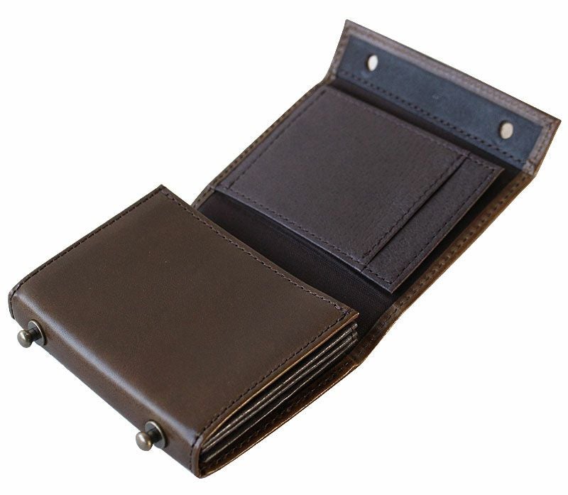 機能的に折り重ねた構造を一枚革で巻きとめギボシで留める財布《millefoglie(ミッレフォッリエ)》。巻いてある革を拡げて中のホックを外せばマチつきの箱型小銭入れが立ち上がります。