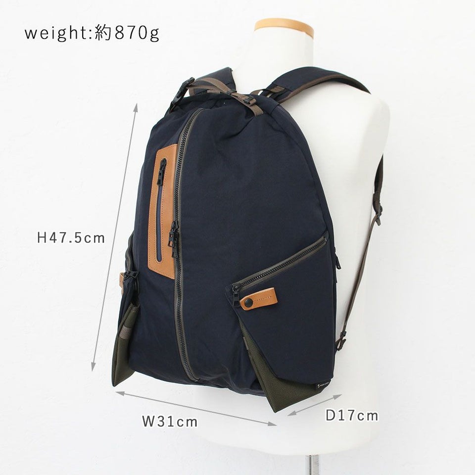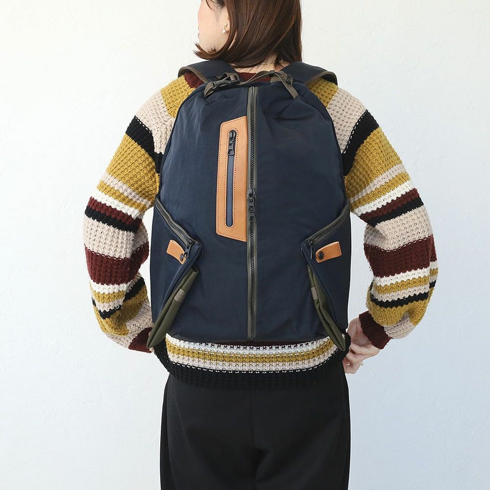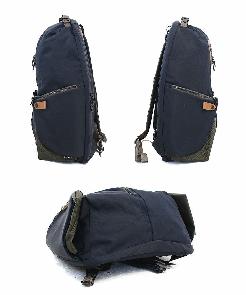 ジェット染色を施したマテリアル、身体に掛かる荷重の負荷を軽減するオリジナル機構の“m-strap”マグネット機能パーツを採用することで容易に開閉が可能になった収納部など、機能性だけでなくデザイン性も両立したバックパック。