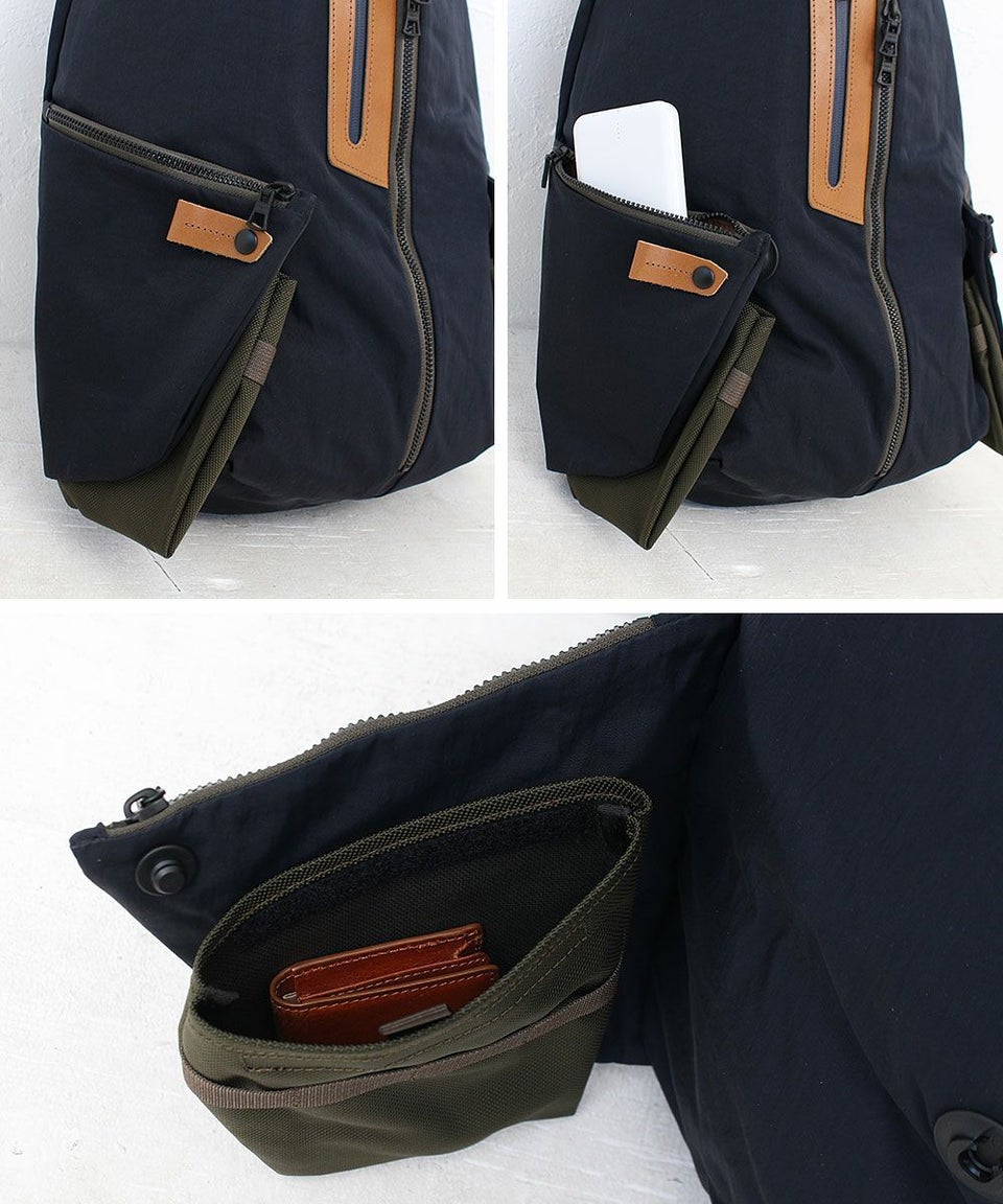 ・フロントファスナーポケットはYKK 社製のアクアガードファスナーを使用し、さらに収納部の袋布には、透湿防水性能がある3レイヤーナイロンファブリックを採用。