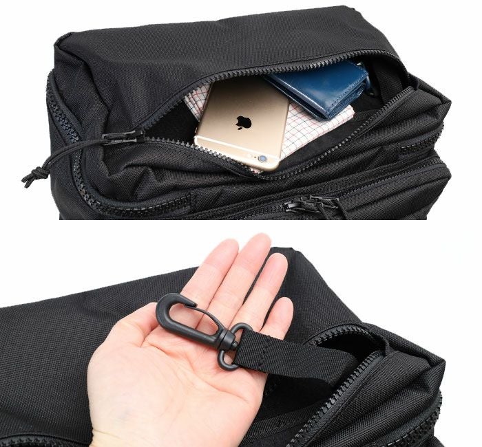 上部のポケットには、鍵などを管理しやすいナスカンを配備しています。