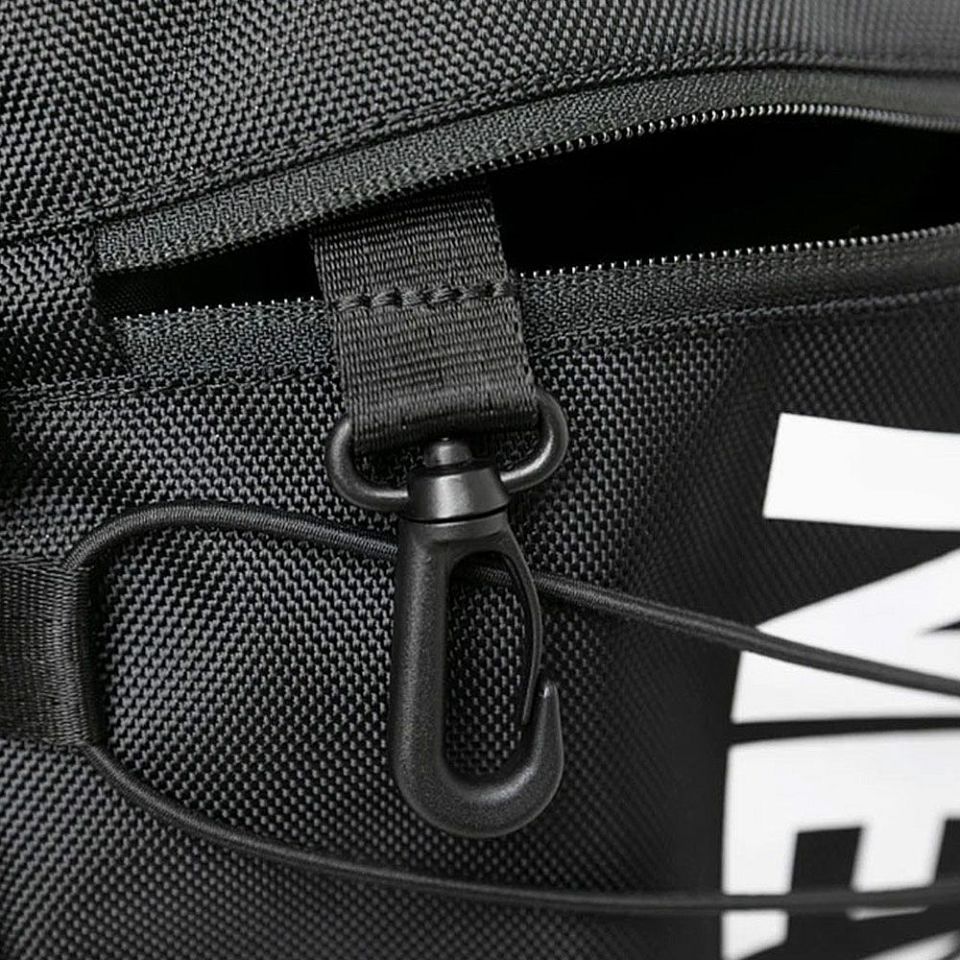 フロントに配置されたバンジーコードがデザインのアクセントに。衣類やタオルなどをサッと挟んで固定でき、持ち運びの自由度が広がります。