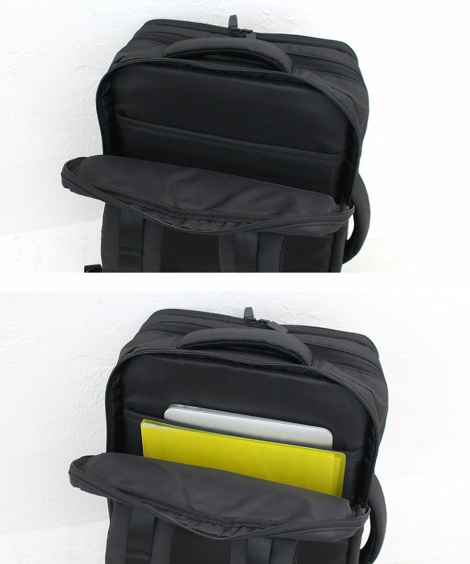 メイン収納に加え、パソコンや折り畳み傘などあらゆる必需品のサイズに想定された収納ポケットが多数あり、 スムーズなアクセスと出し入れが可能。