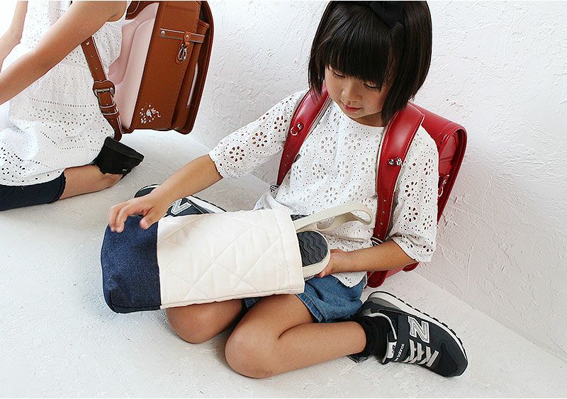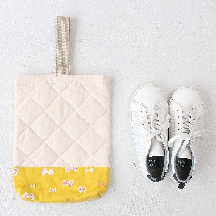 当店オリジナルの切り返しの布が可愛い、運動靴や上靴入れにぴったりのシューズバッグ♪