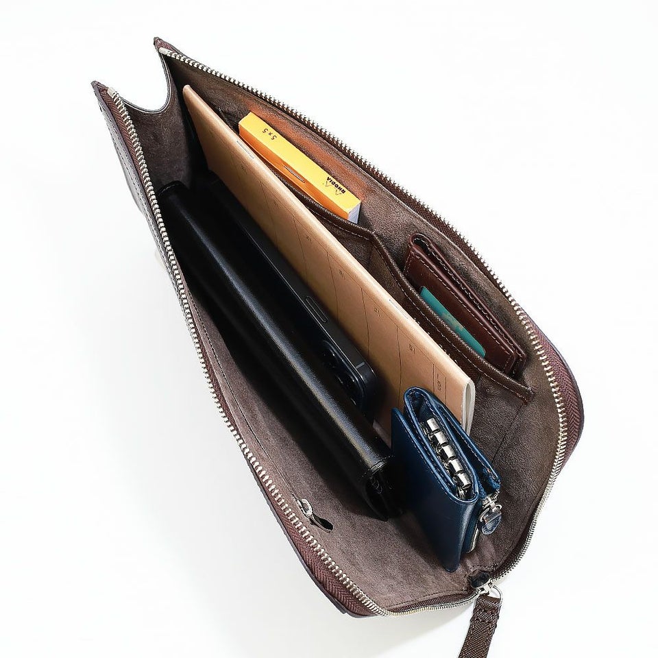 張りのある牛革を贅沢に使用し、スーツにも私服にも映えるスマートなルックス。バッグインポーチとしても使え、ビジネスからパーティーまで活躍します。