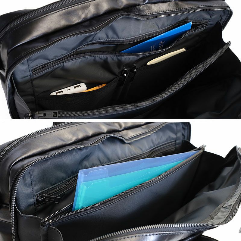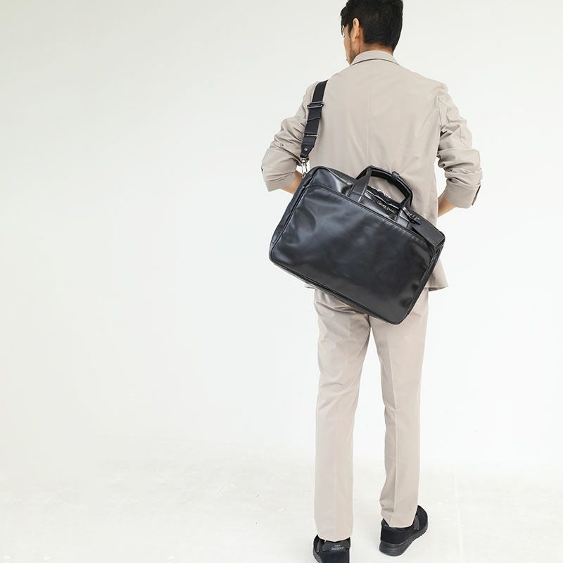 B4サイズに対応した2層式ビジネスバッグ。ショルダーベルトが着脱可能で、物の仕分け管理に優れたポケットが充実しています。前面収納は収納口が広く開閉し、ビジネスツールの収納に便利なオーガナイザーポケットを備えています。
