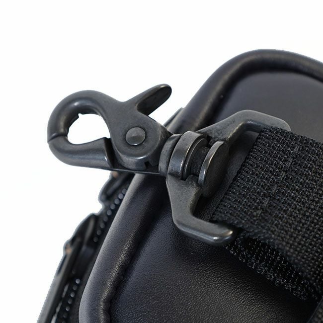 革製品のヘリ巻きには本体と同素材を使うのが一般的ですが、このシリーズではナイロンテープを使用して視覚的な引き締め効果を狙っています。