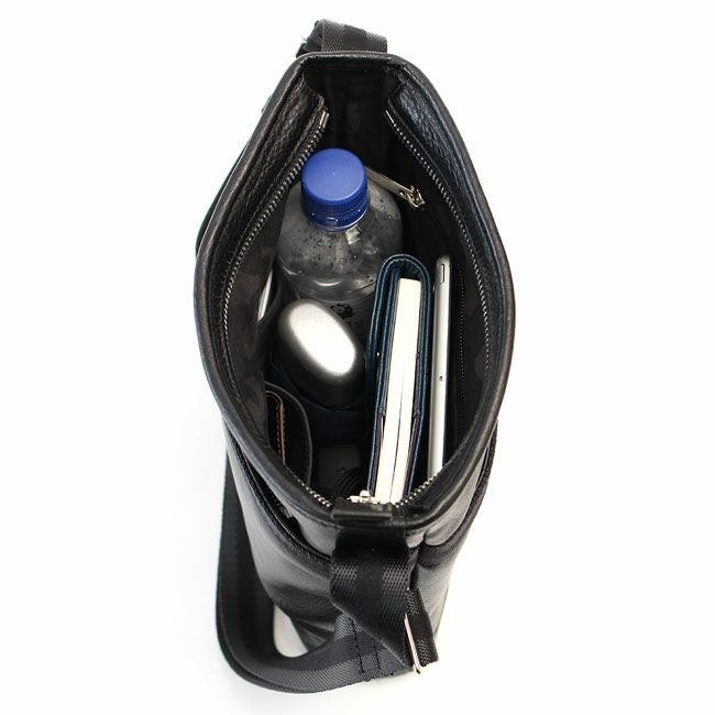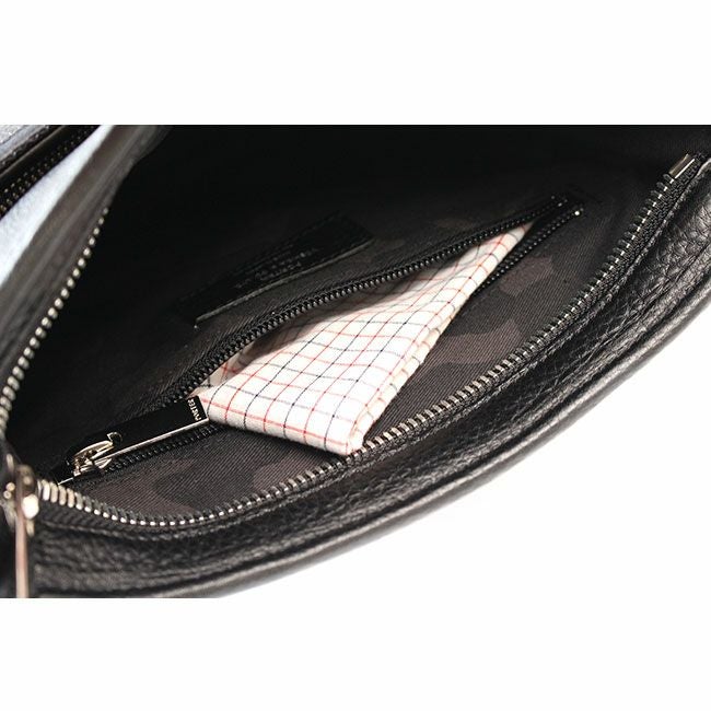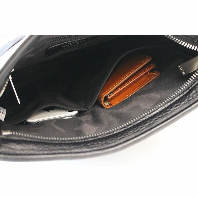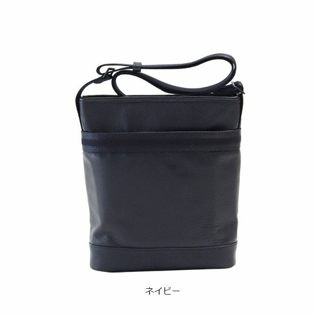 タッチ感の良いシュリンク革とシャープに見えるナイロンテープを組み合わせたレザーバッグをメインにしたトータルシリーズです。要所にライン柄のテープを使用することで見た目の軽さとカジュアル感を出すとともにデザインのアクセントにしています。メイン素材の革は国内原皮の牛ステアをクロームで鞣した後にシュリンク加工を施しています。薬品によって革を縮ませた後、さらに回転ドラムで空打ちすることで凹凸のあるシボを作り出しています。内装は全色ともに迷彩柄のプリントが入ったブラックコットンツイルで統一し、大人っぽいルックスながら内装には遊び心を取り入れて程よいカジュアルさを演出しています。ファスナーは操作性が良いシンメトリックファスナーを使用しており、配置する箇所によって番手の異なるファスナーを使い分けています。エレメントの色は、ブラックには光沢のあるエバーブライトのシルバー、グレー・ネイビーにはマットブラックを合わせています。金具の色もファスナーに合わせブラックには光沢のあるシルバーを、グレー・ネイビーにはマットブラックを合わせました。