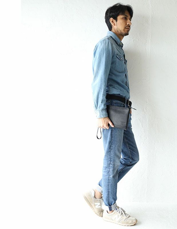タッチ感の良いシュリンク革とシャープに見えるナイロンテープを組み合わせたレザーポーチ。