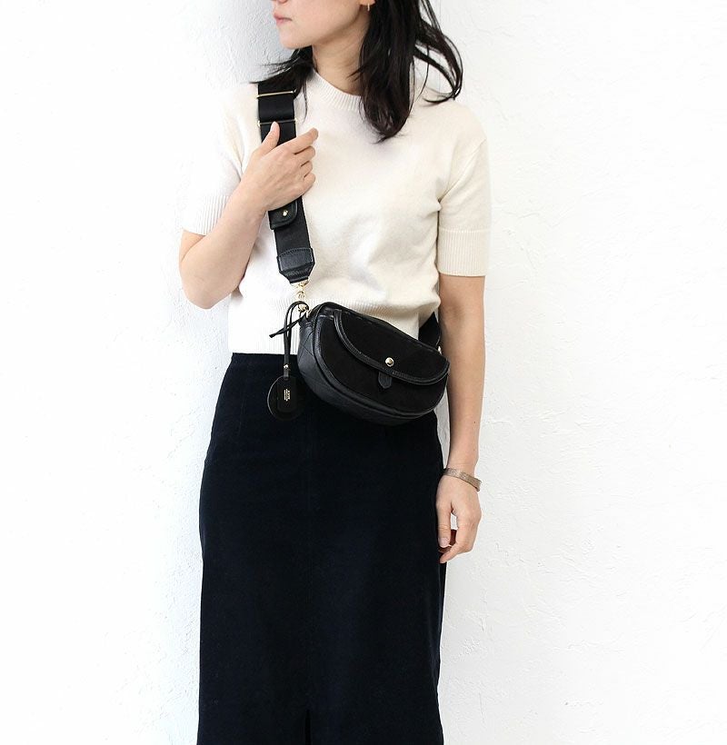 また、ショルダーストラップのナスカンなどの金具使いやカバンの底部分に施したステッチワークなど、シンプルなデザインながらも存在感のある佇まいも魅力的です。