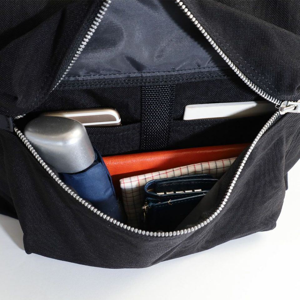 ファスナーポケットはマチが広いので折り畳み傘やお財布もすっぽり収納可能です。