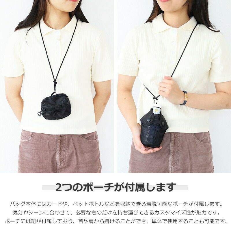付属ポーチにはカードやワイヤレスイヤホンなどの身の回りの細かなものや、ペットボトルなどが収納できます。