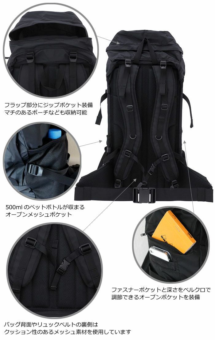 マットな質感、余計な装飾を除いたシンプルなルックス、使うほどに発見がある機能美で人気のシリーズ。マットブラックの超軽量高密度ナイロンに透湿加工を施し、抜群の撥水性と機能性を誇り、アウトドアのバックパックの野暮ったさやゴツさを排除した、都会的なイメージに仕上がっています。