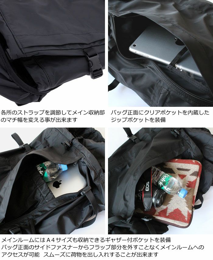 メイン収納部内側には、A4サイズに対応したギャザー付きポケットを装備。衣類やポーチなど1、2泊の旅行にも対応できる大容量のリュックサックです。バッグ各所に配されたストラップを調節することで、マチ幅を変えることができるのもこのリュックのポイント。荷物量に合わせてシルエットを変えることが出来ます。
