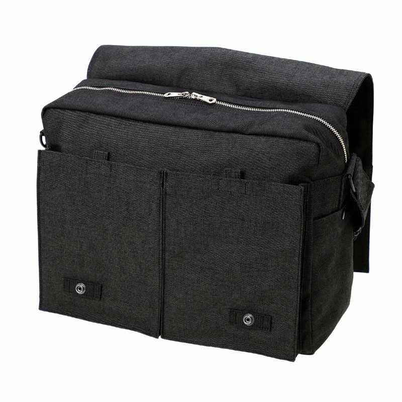 ショルダーバッグはA4サイズの書類が入るサイズでマチ幅もあり、かさばる荷物の収納も可能です。フラップにはスマートフォンやパスケースなど、取り出す頻度の高い荷物を収納するのに便利なポケットを備えています。ショルダーストラップの付け根にDカンを付属しているので可動域が広く、体にフィットしやすい仕様です。本体上部のハンドルで、手持ちのスタイルで持ち運ぶこともできます。