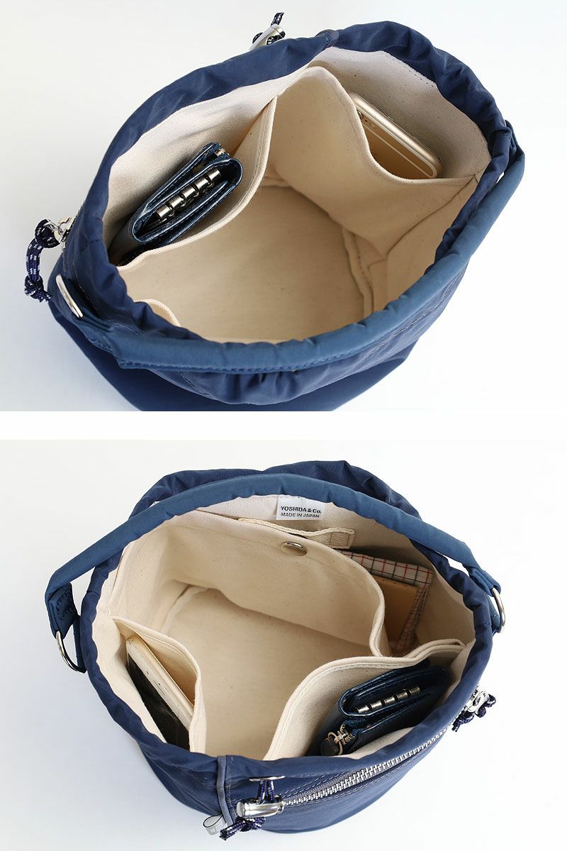 本体はキュッと縛る巾着開閉で中にはスナップポケットをひとつとオープンポケット二つ用意。