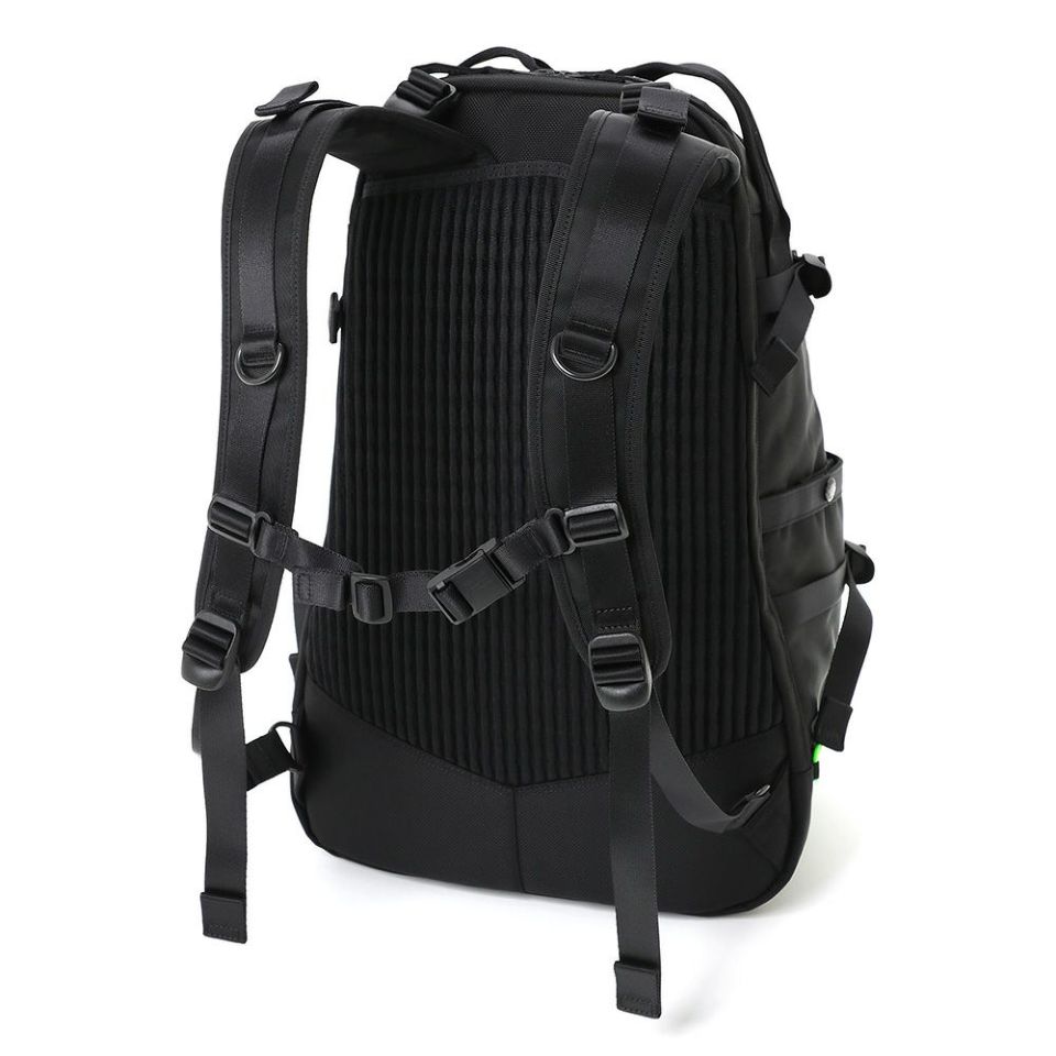背負った時に目を引く底部のストレッチコードは伸縮性があり、衣類や折り畳み傘などを 簡易的に収納するのに便利な仕様です。各アイテムには、ビジネスシーンにも対応するブラックとスポーティーな印象の蛍光グリーンの2色のストレッチコードが付属し、気分によって付け替えを楽しんでいただけます。
