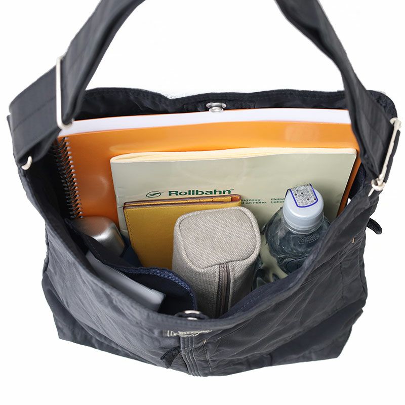 雑誌やA4サイズのファイルが収納できるサイズで、ペットボトルや折り畳み傘などの持ち運びもしやすい縦長フォルムが特徴です。