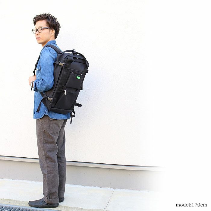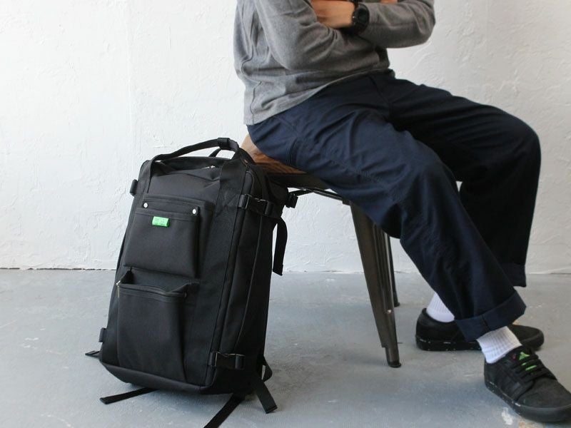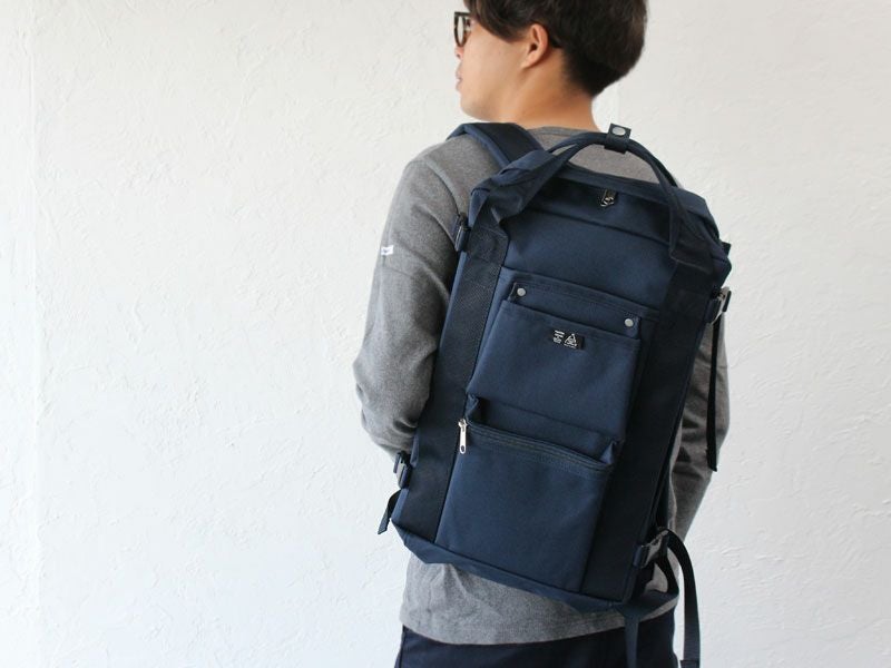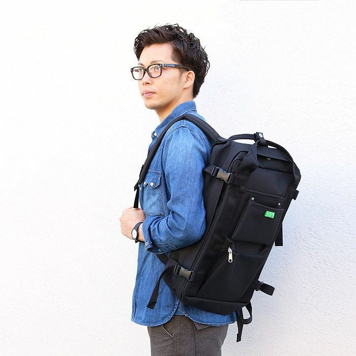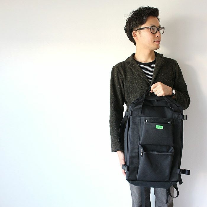 生地裏にはP.V.C.加工が施され、撥水性があるので、汚れた衣類、濡れたペットボトルなども安心して収納することができます。 外側に取り付けられた工具バッグを意識したリベット打ちのポケットもデザインのアクセントに。また、ダブルファスナーでフルオープンにもなります。