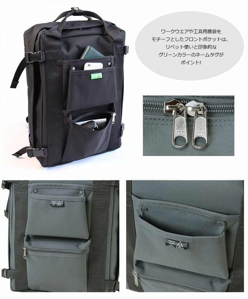 ■シリーズ案内:2016AWにグレーとネイビーが新色で加わったポーター人気シリーズ。コットンよりも軽量で、色落ちがしにくい特性のあるポリエステルキャンバス生地を使用したリュックタイプのシリーズです。ワークウエアや工具用腰袋をモチーフとしたフロントポケットは、リベット使いと印象的なグリーンカラーのネームタグ(グレーとネイビーは本体と同色のタグ)がポイント。