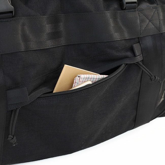 素材には引裂・摩擦強度に定評のある1000デニールのコーデュラナイロンを使用し、さらに摩擦の多い角の部分にはテープを縫い込んで補強をしています。また、ストラップの付け根など、負荷の強い箇所にはバータック(カンヌキ)を施し、同じく補強しています。要所に用いたナイロンテープも例えば、リュックストラップやコンプレッション(天マチを絞る)ストラップには調節がしやすいように織り目の粗いテープを使用するなど、構造や機能に合ったものを厳選して使い分けています。