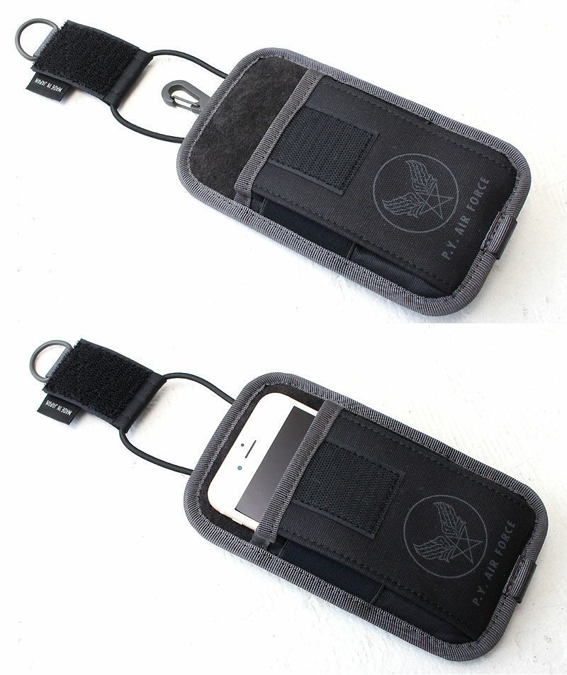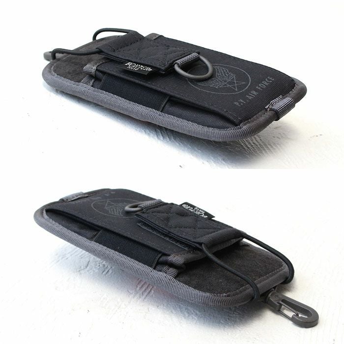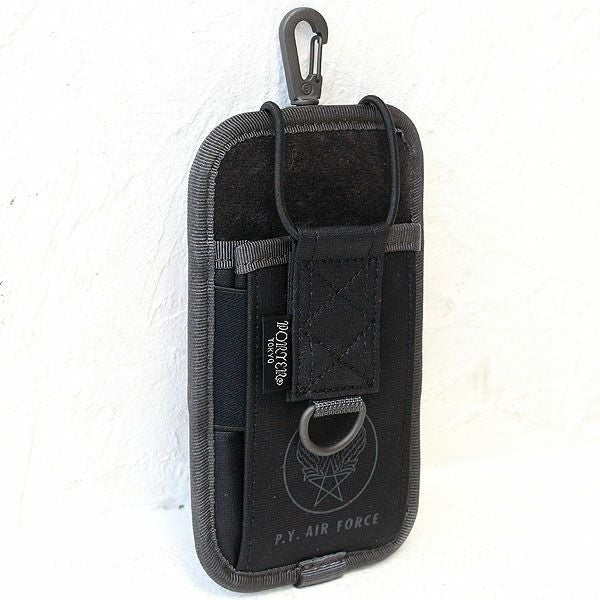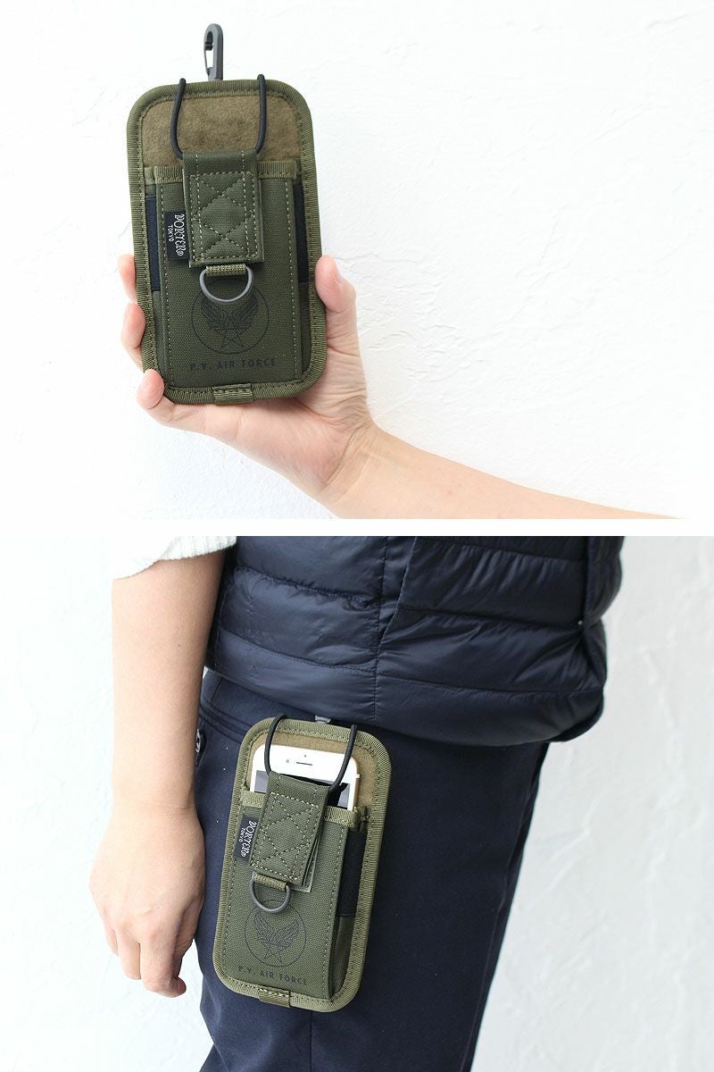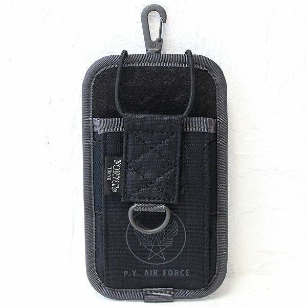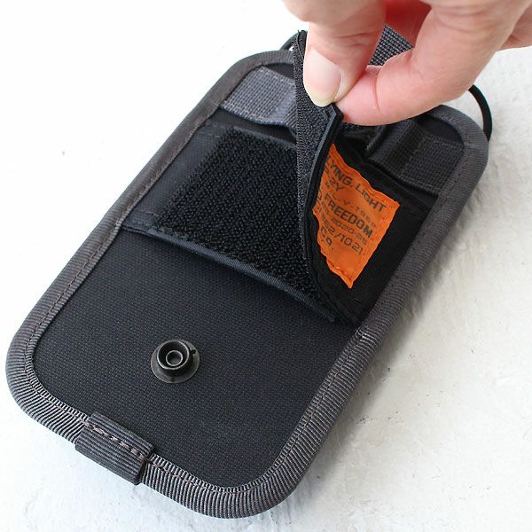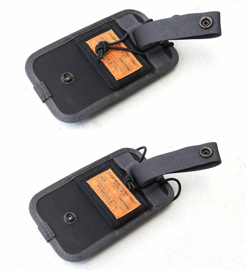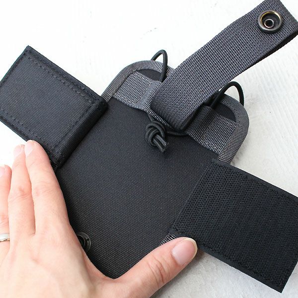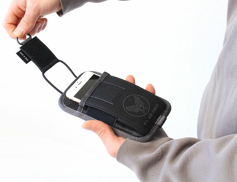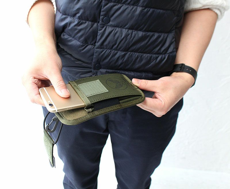 フライングエースのマテリアルは当時のフライングスーツから着想を得て、メイドインジャパンの高い技術力で糸から組織まで新たに開発した完全オリジナルです。摩擦や屈曲性に強く滑らかで光沢感のあるナイロンフィラメントを高密度かつ軽さを兼ね備えたオックスフォードピケ調に織り上げました。表面にはシレ―加工を施し、独特な光沢感とハリ感を持たせています。 こちらは大きめのスマートフォンも収納できるモバイルホルダーです。ホルダーを固定する仕様が3箇所あり、上部に付いたナスカン、縦に伸ばしたホック付のナイロンテープ、横に配した面ファスナーテープです。Dカンやバッグのストラップ、パンツのベルトループなど、自分の待ち運びしやすいところでアタッチメントが可能です。