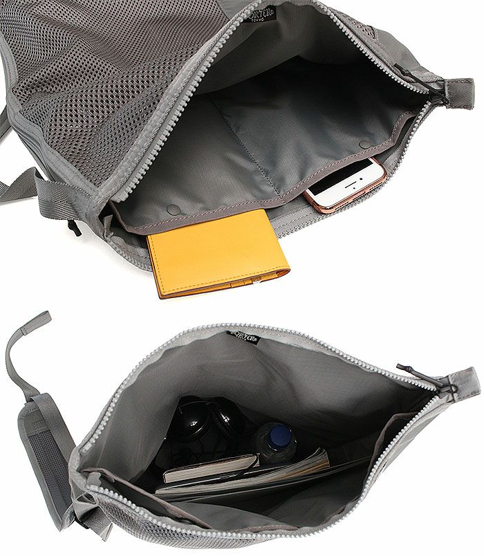 内装にPVC加工したナイロンリップストップ素材の収納スペースを取り付けることにより、湿ったものと乾いたものを分けて収納できる仕様で、特にレジャーシーンでの使用に機能を発揮しつつタウンユース機能も十分に持ち合わせているのが最大の特徴です。