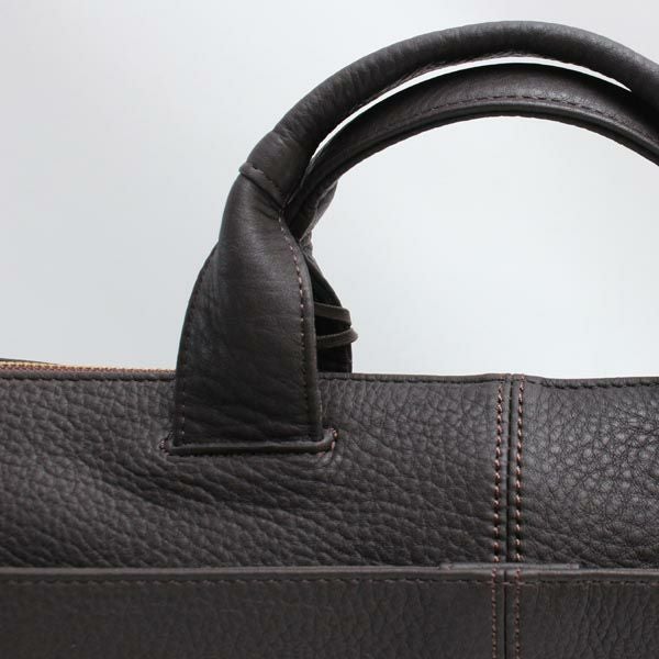 金具をほとんど使わない事でスッキリと上品に仕上げ、また芯材も極力排除する事で、革本来の持つ風合いを最大限に活かしています。胴体部分には2枚の革を接ぎ合わせ、その接ぎ合わせた部分とハンドルの根革に太番手の糸で施したステッチがデザインのアクセントになっています。