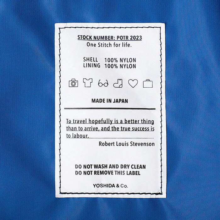全型にオリジナルジップパックが付属します。内装にはロバート・ルイス・スティーヴンスン※の言葉を載せたタイベック素材のタグが付きます。