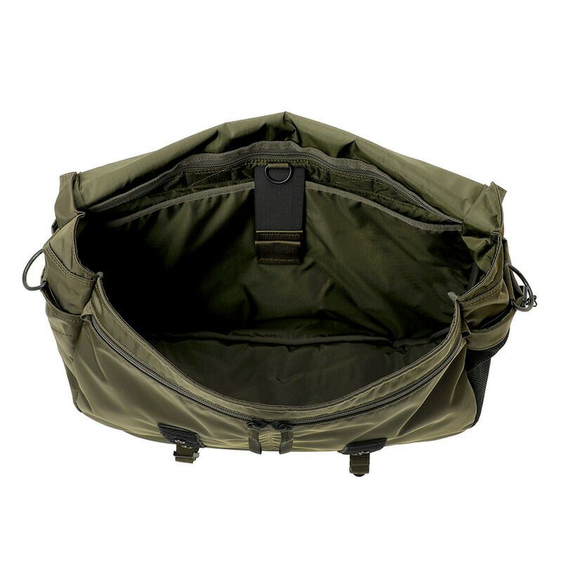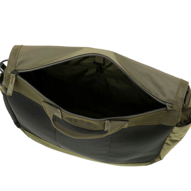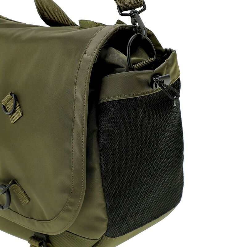 メッセンジャーバッグは大容量のメイン収納部と、内装に16inchのPCを収納できるクッション材入りのポケットを設けています。サイドポケットには600mlのペットボトルや折り畳み傘を収納することができます。背面側の上部にファスナーを設けることで内装に直接アクセスできる仕様で、フラップを開けなくてもPCや荷物を取り出すことが可能です。また、収納部の口元部分を金具で留めることができる仕様のため、型崩れしにくいのもポイントです。