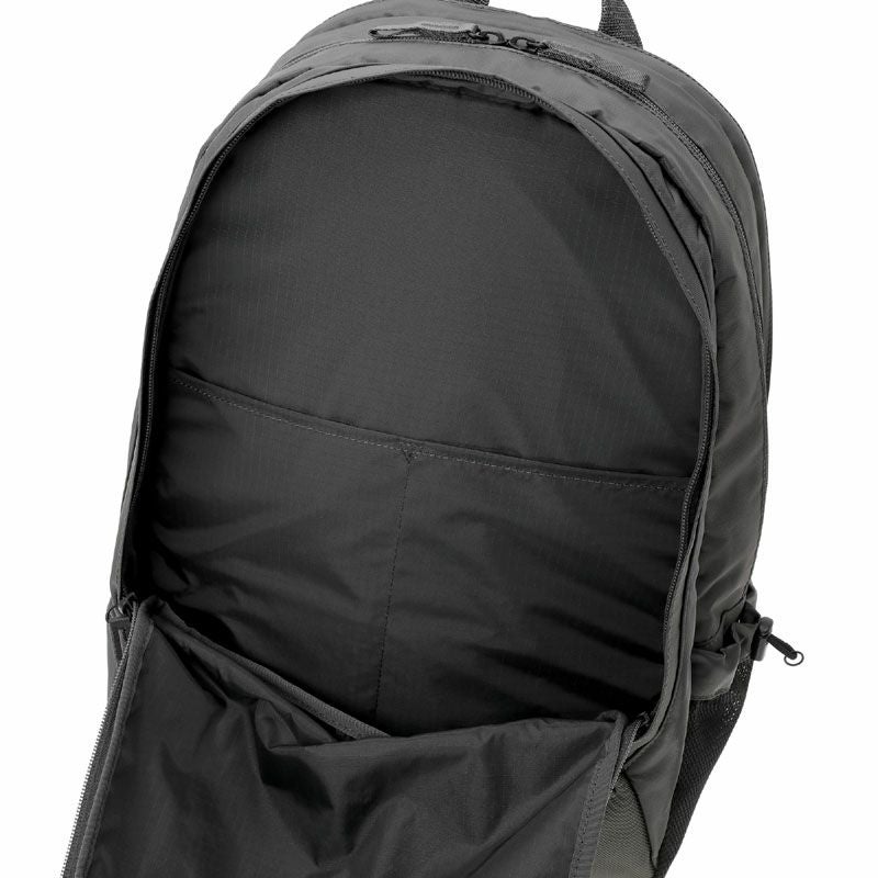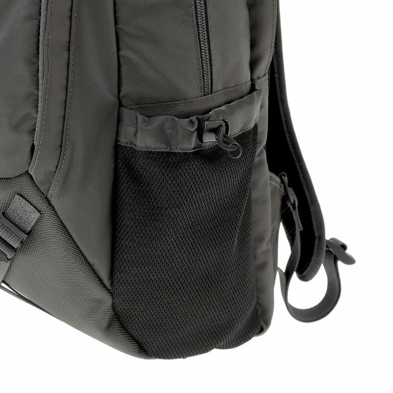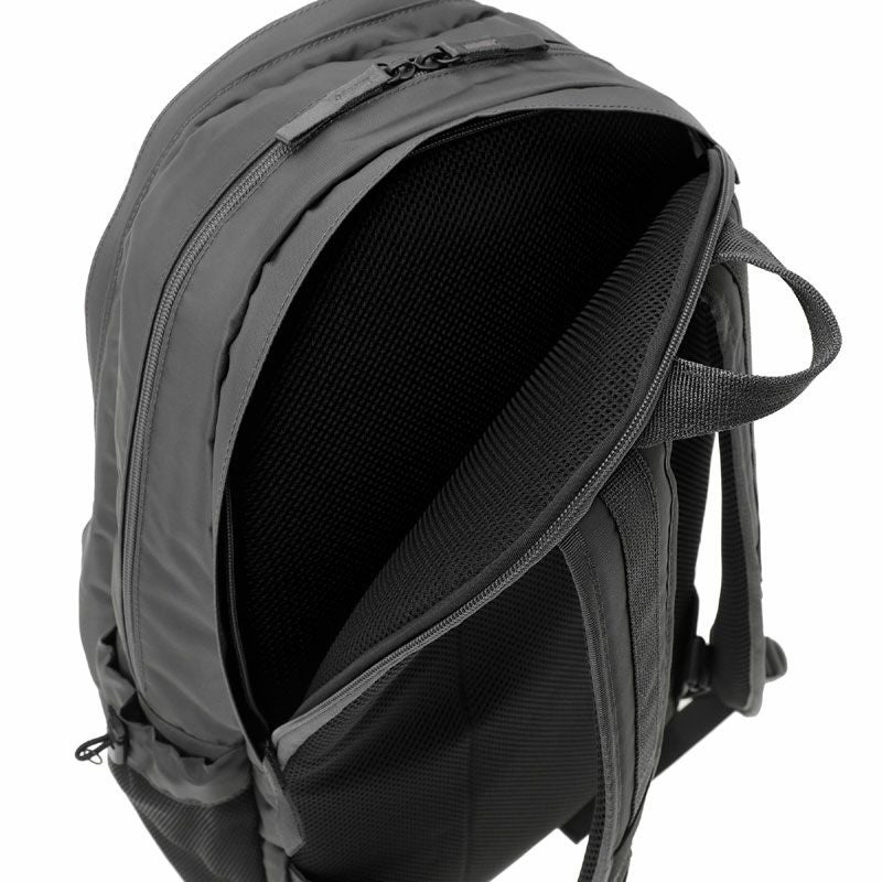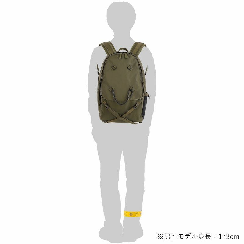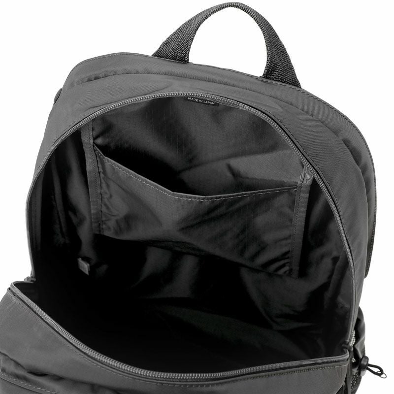 デイパックは3層構造の収納部を設けたオン・オフ問わず使える機能的なアイテムです。メイン収納部はファスナーによって大きく開くため、中の荷物が見やすい仕様です。後層部分の内装にクッション材を配しており、16inchのPCを収納可能です。前層部分は内装にスマートフォンやウォレットなどを収納できるポケットを設けています。サイドポケットには600mlのペットボトルや折り畳み傘が収納可能です。