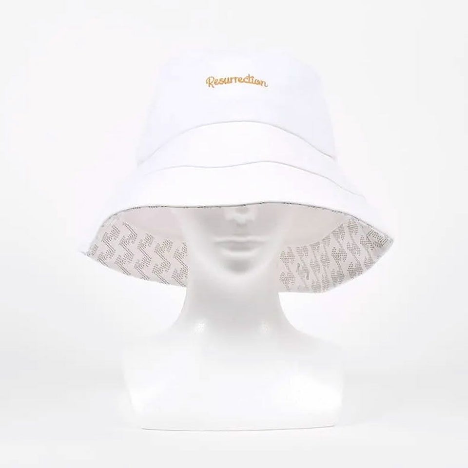 つばの前の部分を折り返すと印象が変わって可愛い。グレージュ一色に統一されたレザレクション柄がさりげなくチラリと見えるのも良いですよね。