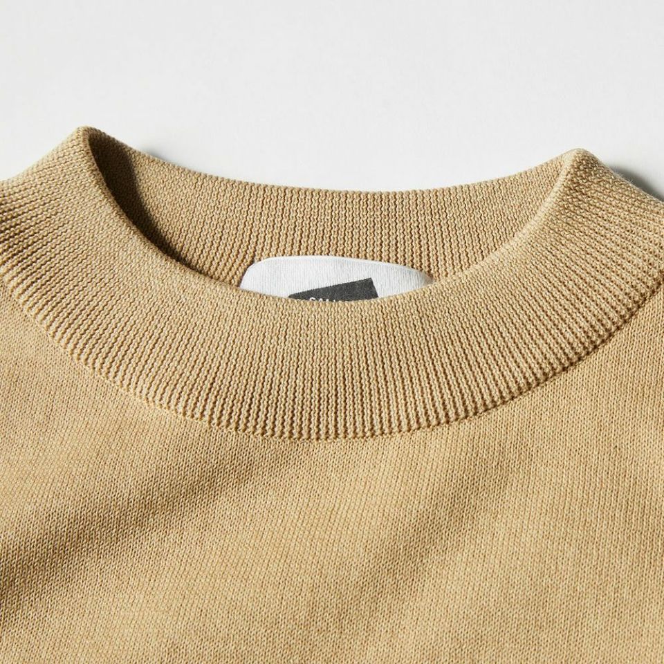 表面はエアリーな膨らみを持つウォッシャブル(防縮)ウールを使用し、裏面は日本国内で回収されたペットボトルを原料として製造されたリサイクルポリエステルを使用してプレーティング編みをした1着。