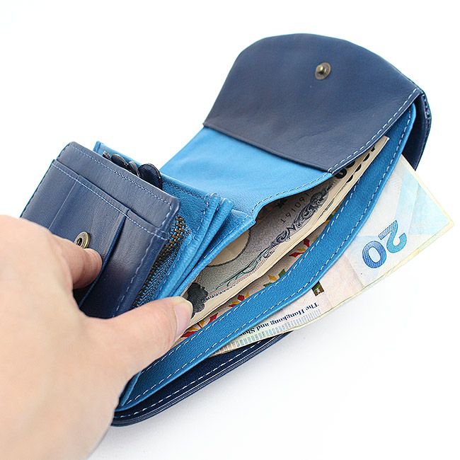 片手でさっと取り出せる二つ折りタイプ。ワンタッチ開閉なので、中身が一目で確認できます。 カードポケット6カ所、フリーポケット2ヶ所、お札入れも2層式で収納力があります。ツヤ感を増すヌメ革とともに長く付き合えそうなお財布です。