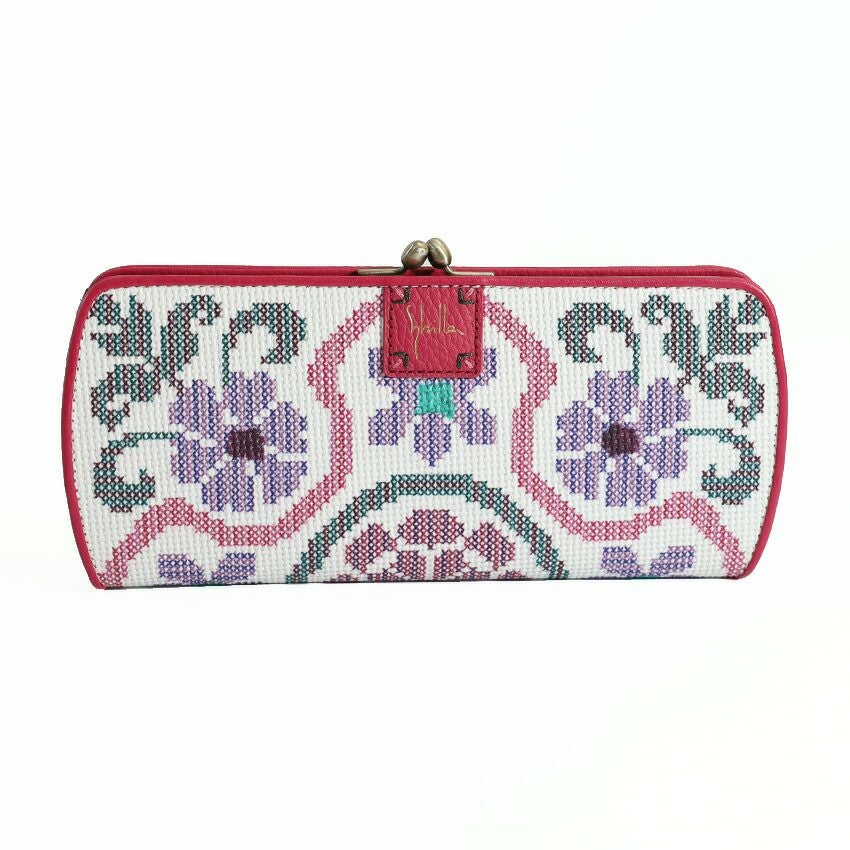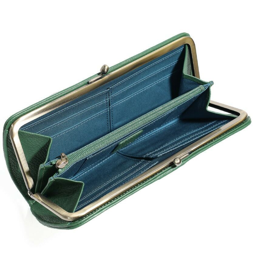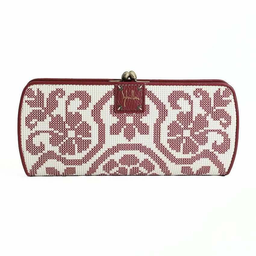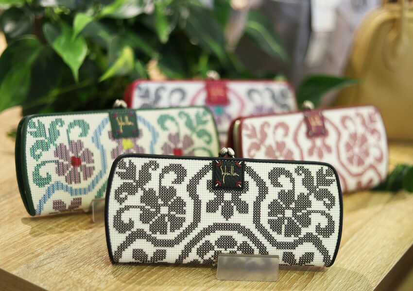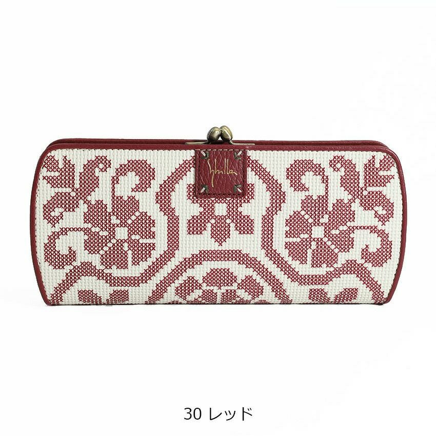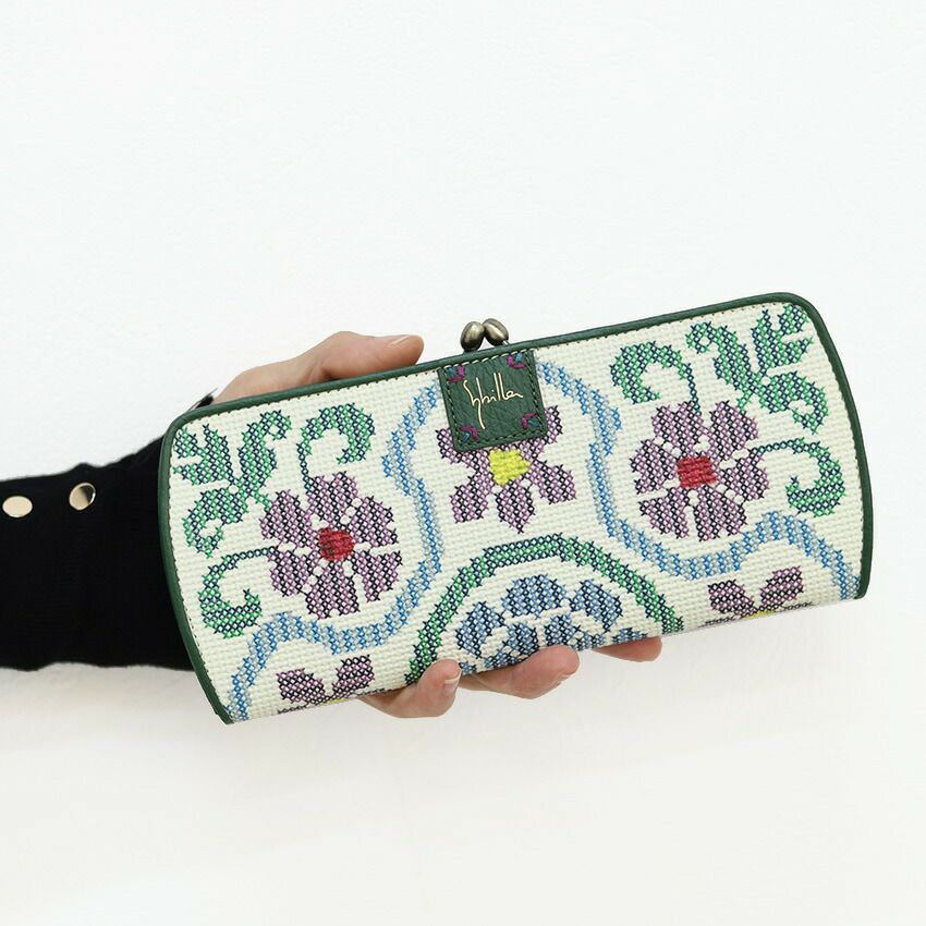 がま口が印象的な長財布。テクニックを駆使し、まるで刺繍の様なデザインを型押しで表現しています。