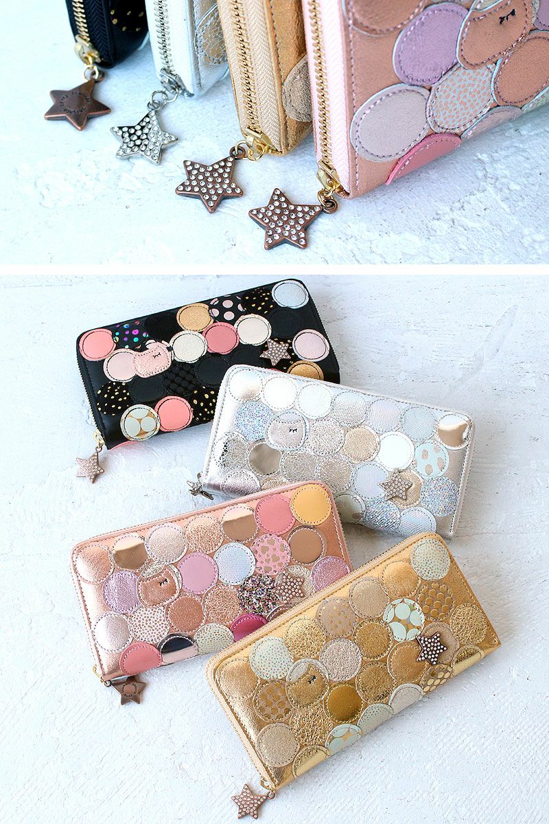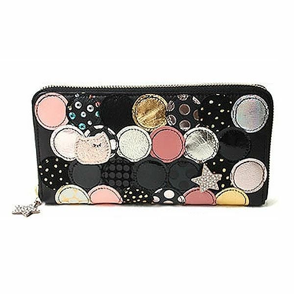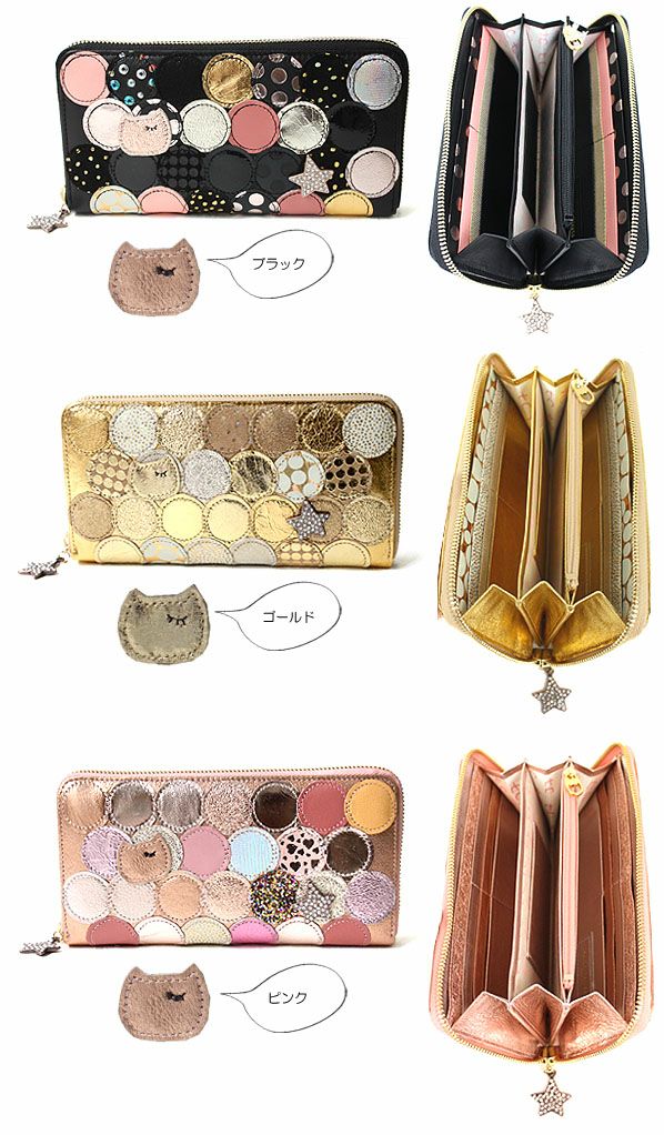 使い勝手抜群のラウンドファスナータイプの長財布です♪色々な素材やデザインをまん丸なカタチにパッチワークした大人かわいいツモリチサトの長財布。ドットのパッチワークの中にさり気なくツモリチサトおなじみのネコちゃんや、キラキララインストーンのキラキラ星がついています。
