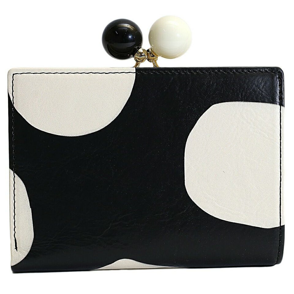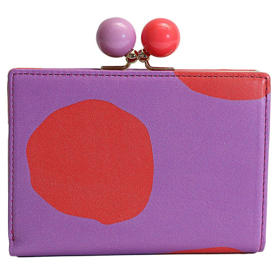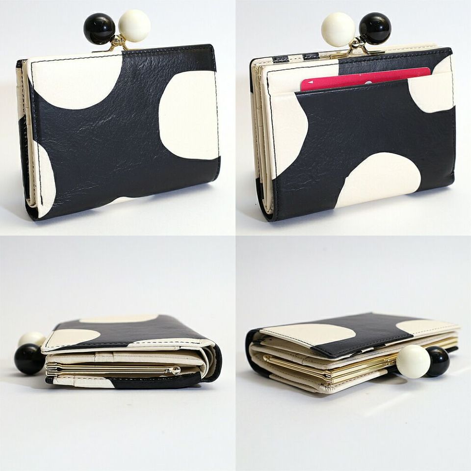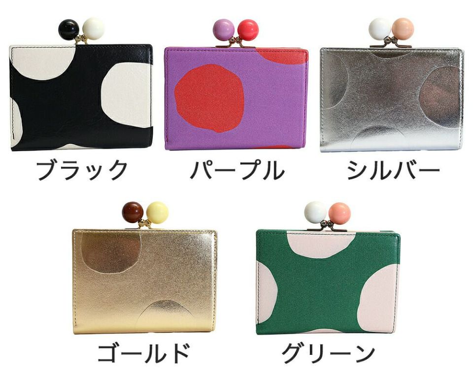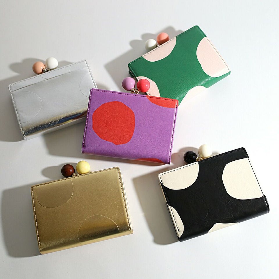 大きな手描きドットがランダムに配された「ズームドット」シリーズのがま口二つ折り財布。