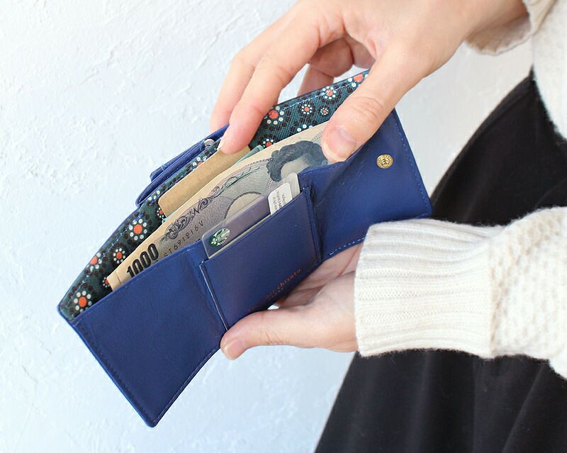 手の中にすっぽり収まるほどコンパクトなサイズ感に札入れと2か所のカードポケット、ボックス型のコインポケットが付いていて、 小さいけれど必要な機能は全て備えています。