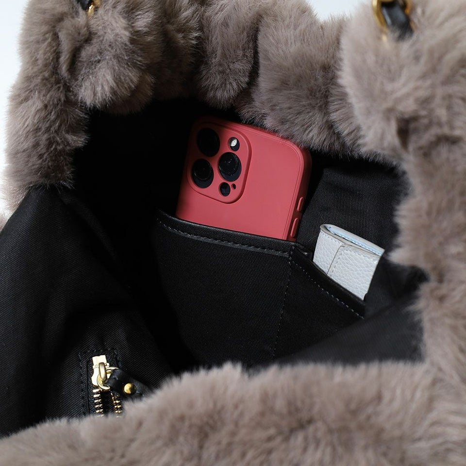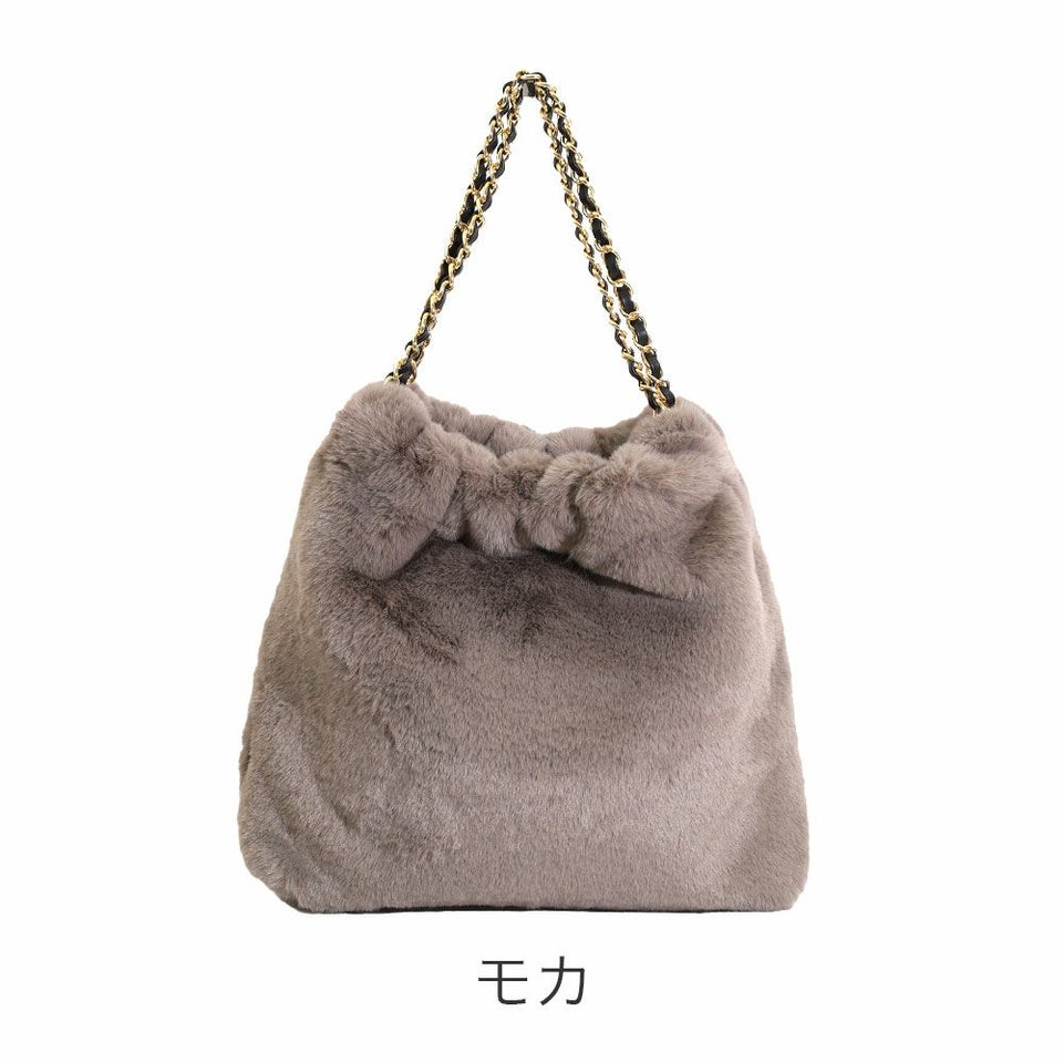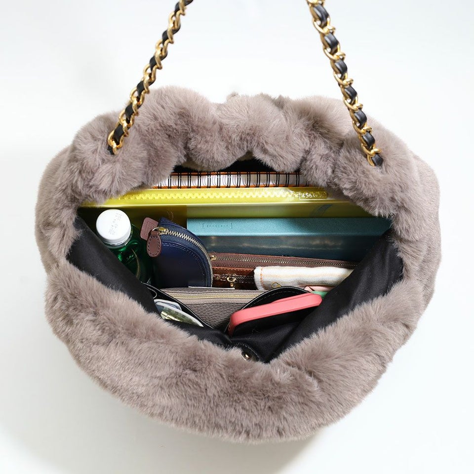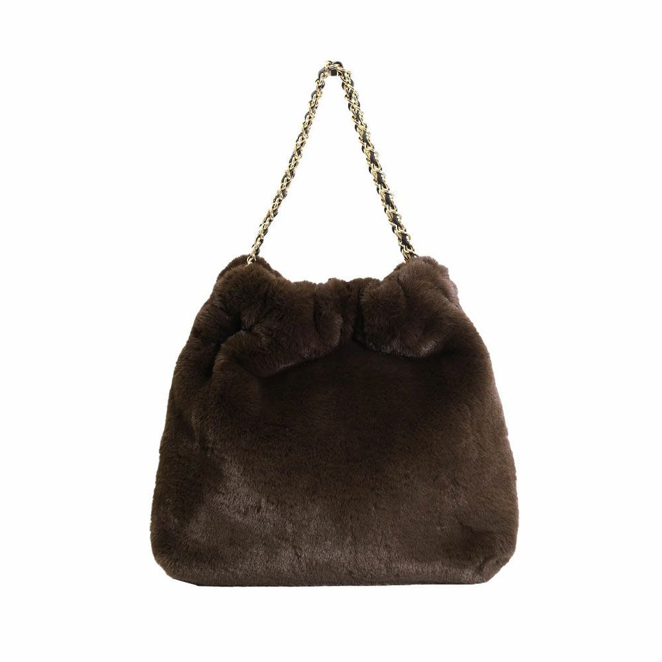持ち手には上品なチェーン使い。光沢のあるファー素材と好相性で、きれいめスタイルにも合わせやすい大人のためのデザインです。