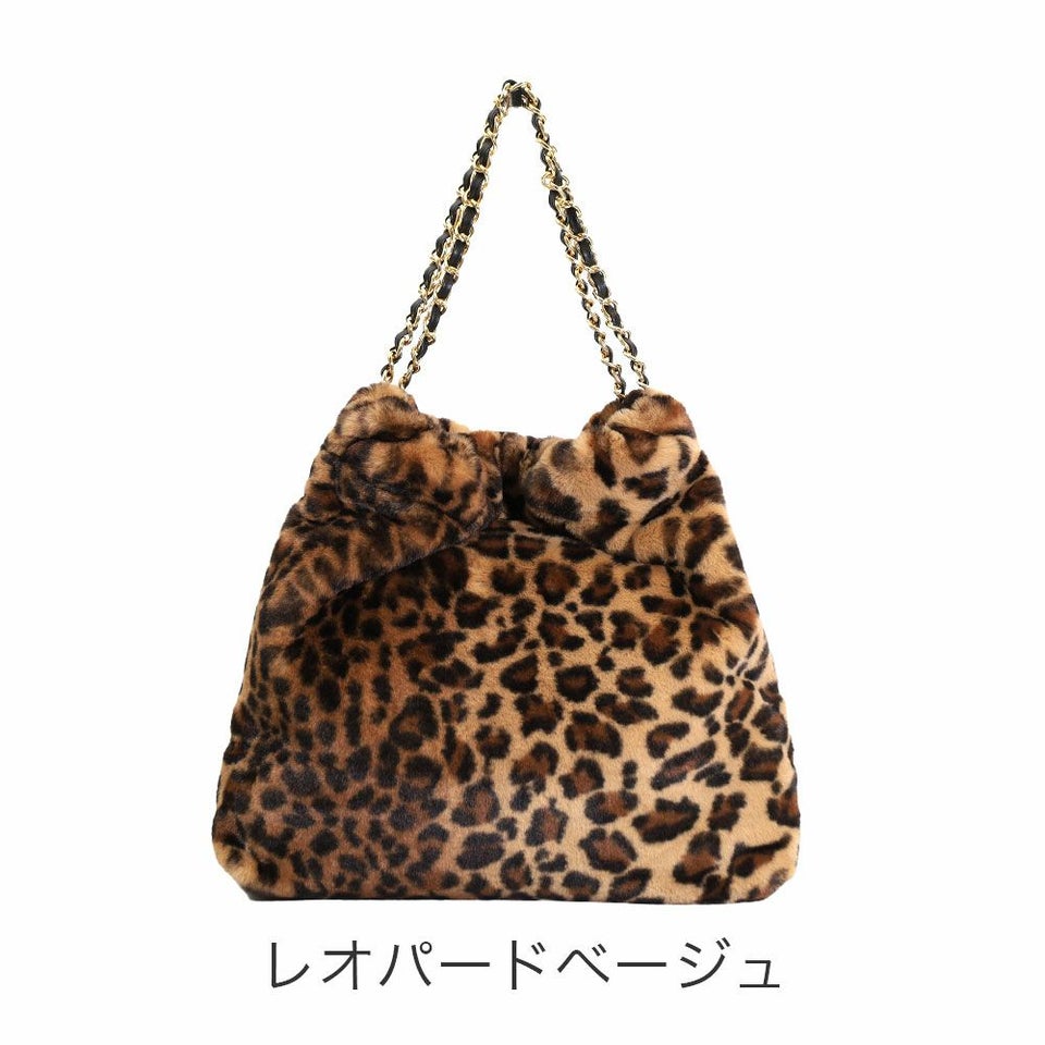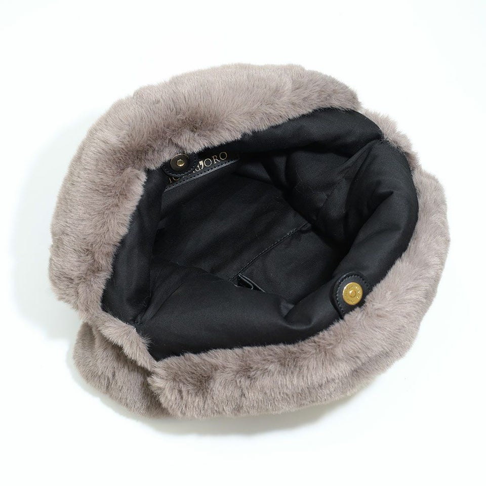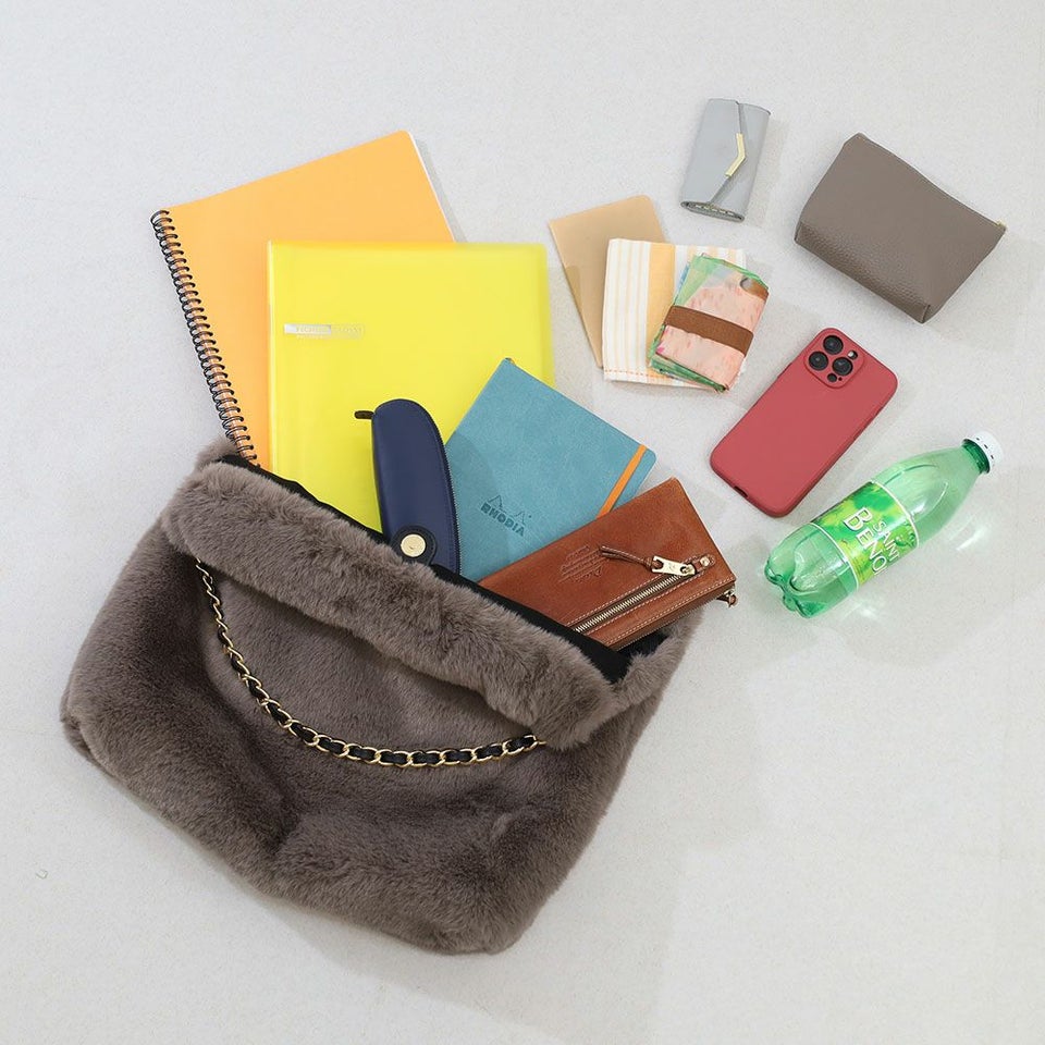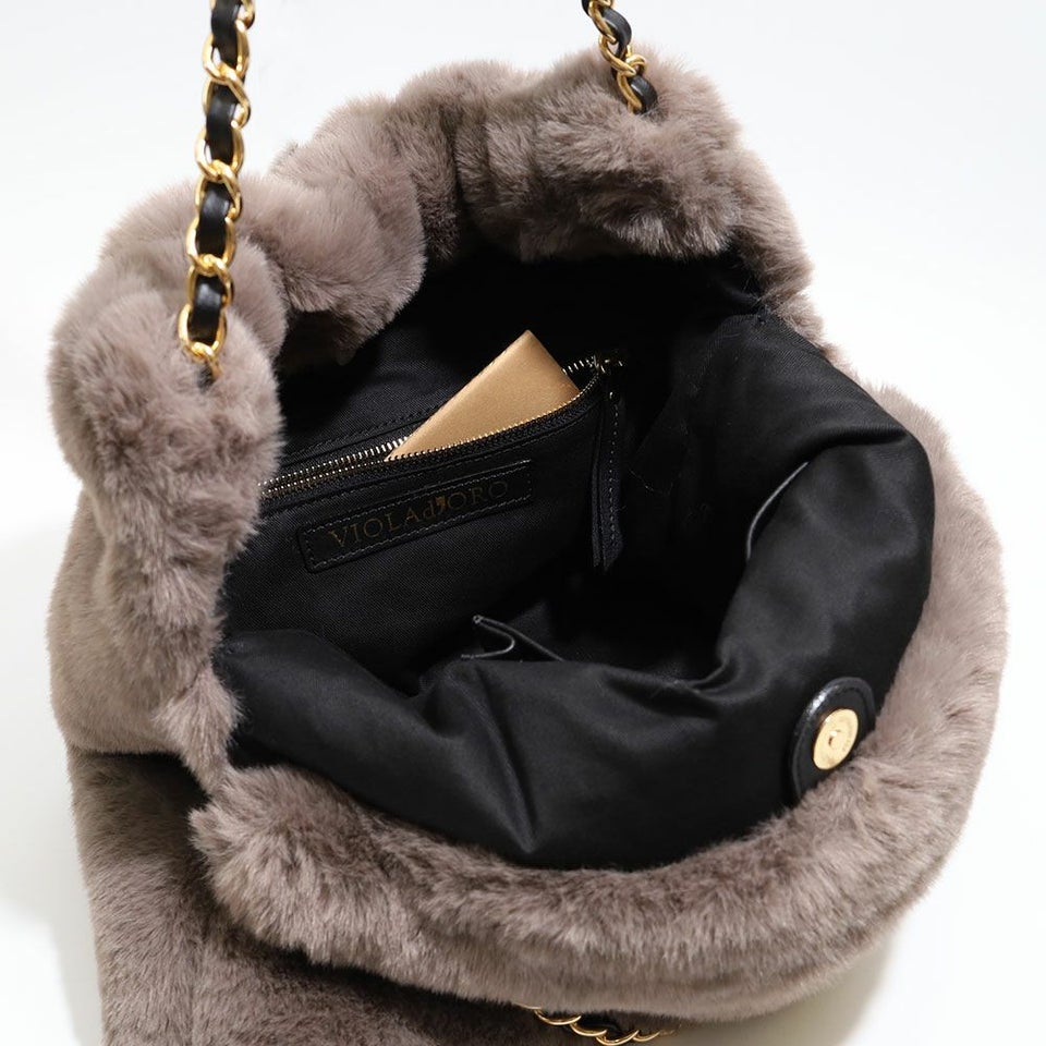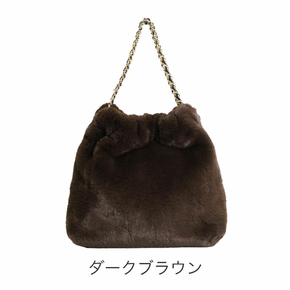 持ち手には上品なチェーン使い。光沢のあるファー素材と好相性で、きれいめスタイルにも合わせやすい大人のためのデザインです。