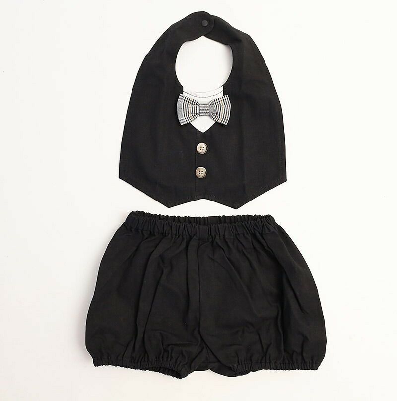 お食い初め(100日祝い)や1歳のお誕生日などの記念日をはじめ、結婚式などのお呼ばれシーンにもぴったりの蝶ネクタイ付きフォーマルベストスタイとかぼちゃパンツのセット。